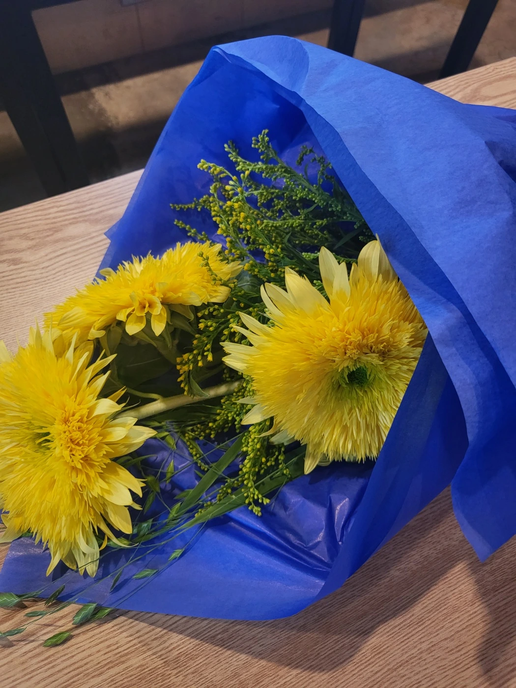 화분 선물을 보면서 2주 전 혜화동 소원책담을 찾아갈 때 사 갔던 해바라기가 생각납니다. 처음 방문하는 길이라 식물을 선물하고 싶었는데 이른 시간 문을 연 꽃집에서 데려갈 만한 식물이 딱 눈에 띄지 않아서 노란 해바라기를 골랐습니다. "기다림, 일편단심"같은 꽃말보다는 노란색이 주는 강렬함이 좋았습니다. 사장님이 진한 파란 포장지에 싸 주셨어요. 노랑과 파랑의 대비... 카페에 있던 어느 분 말씀처럼 고흐의 강렬함이 느껴지는 색조화입니다.