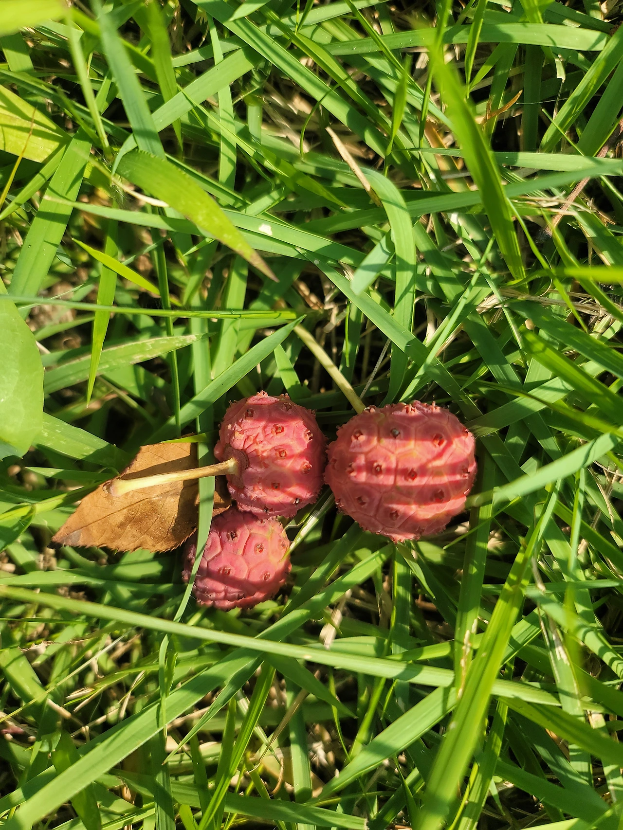 빨갛게 익은 산딸나무 열매가 떨어져 있다. 무슨 일이 있었던 것일까? 채 다 여물지도 않은 것 같은데 말이다.
