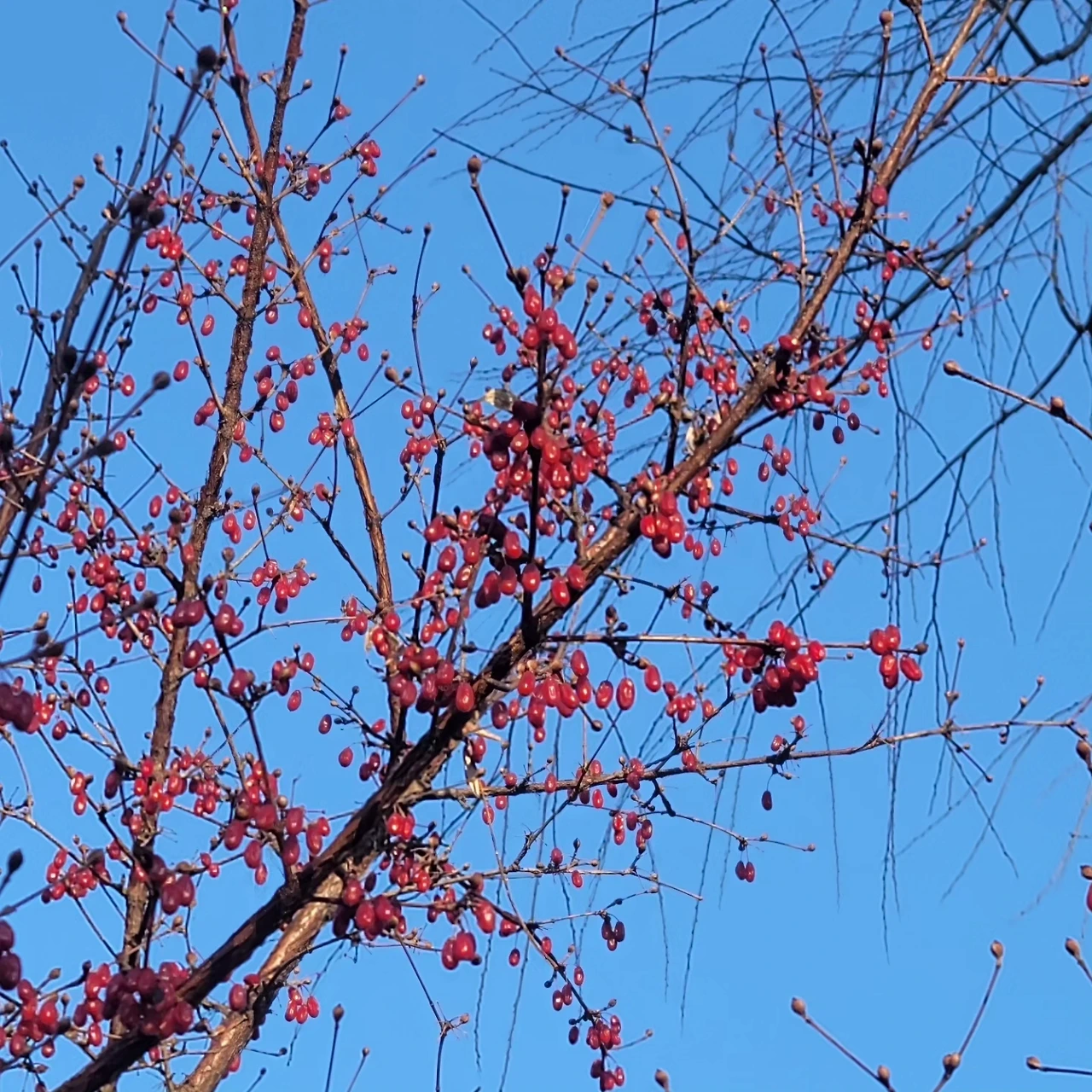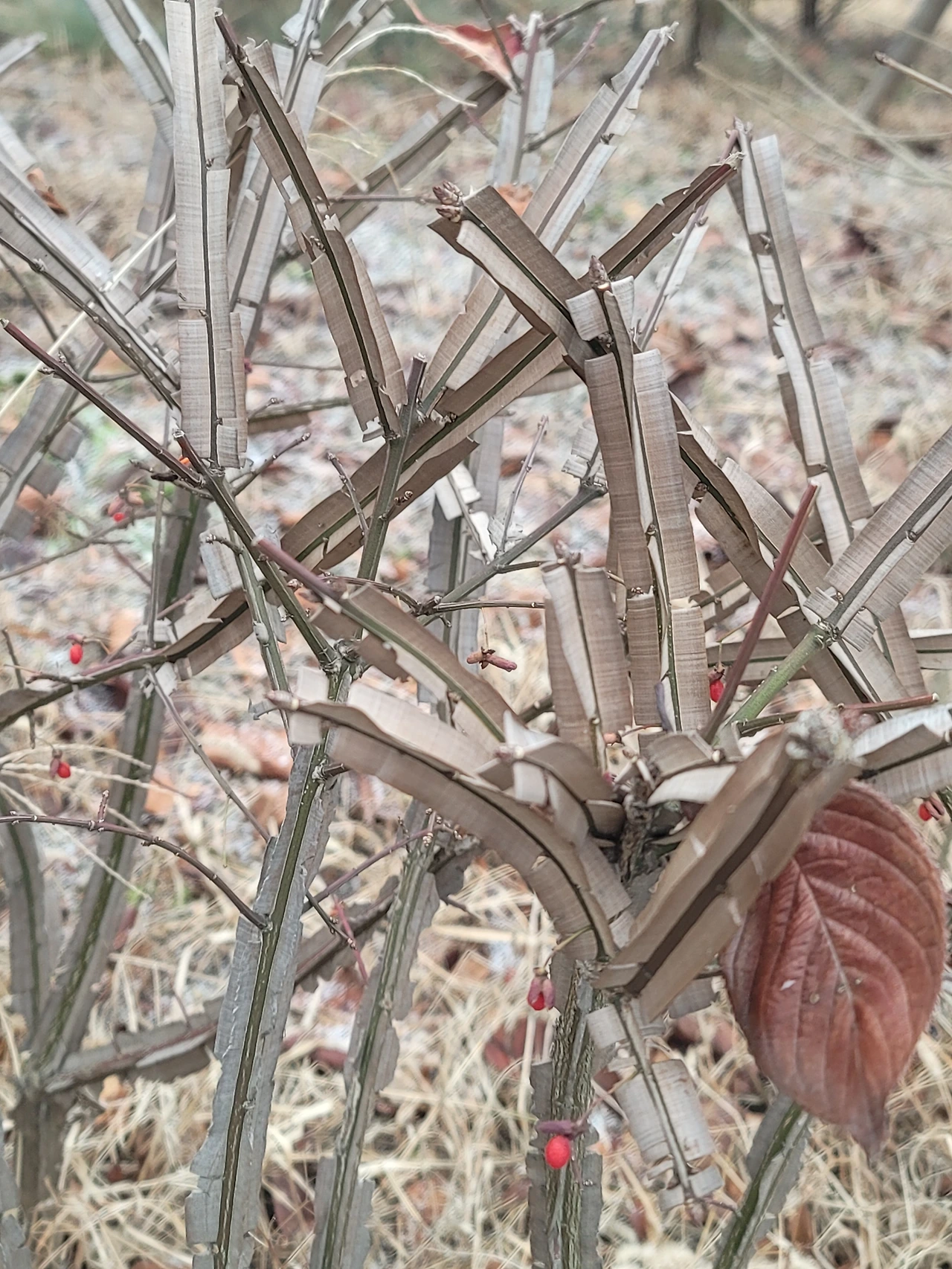 화살나무는 잎이 없어야 그 이름의 유래를 더 잘 알 수 있습니다. 화살나무줄기의 저 날개는(?) 맛이 없다고 합니다. 새들에게서 자신들을 보호하기 위해 코르크 재질의 보호장비를 덧입고 있는 똑똑한 화살나무입니다. 나무를 자세히 보면 빨간 열매를 볼 수 있습니다.