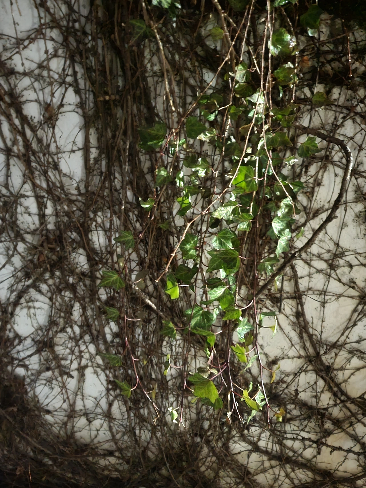 겨울 속 식물들은 자신들만의 빛깔로 시간을 보내고 있습니다. 노지 월동이 가능한 송악(아이비)은 성당 담벼락에 바짝 붙어서 겨울을 지내고 있습니다. 겨울철 야외에서 보기 쉽지 않은 녹색잎 식물 중 하나입니다. 송악보다 더 바짝 붙은 담쟁이가 사진 배경이 되어 줍니다.