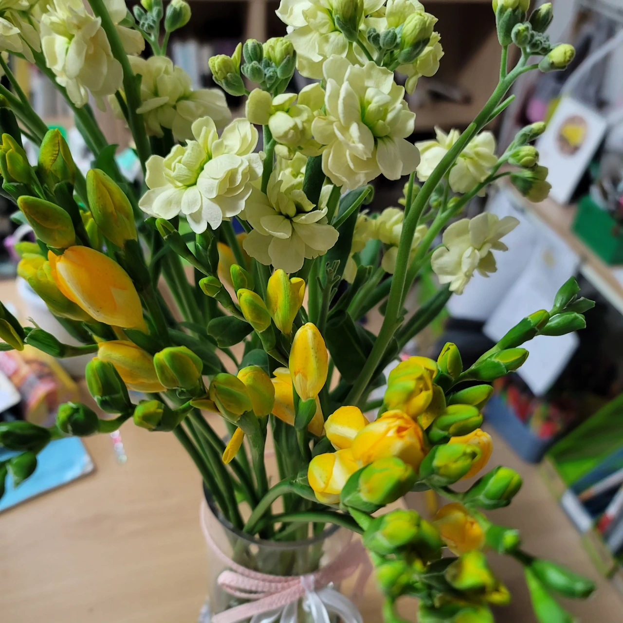 주유를 하러 나갔다가 주유소 옆 꽃집에 들렀더니 아직 꽃값이 비싸다. 그래도 올해 나를 위한 첫 프리지어를 사고 싶었다. 지난겨울 프리지어를 몇 번 샀지만 내 것인 적이 없었다. 오늘은 '내 것'을 가지고 싶었다. 사는 김에 향기 좋은 스토크도 한 단 구매했다.
