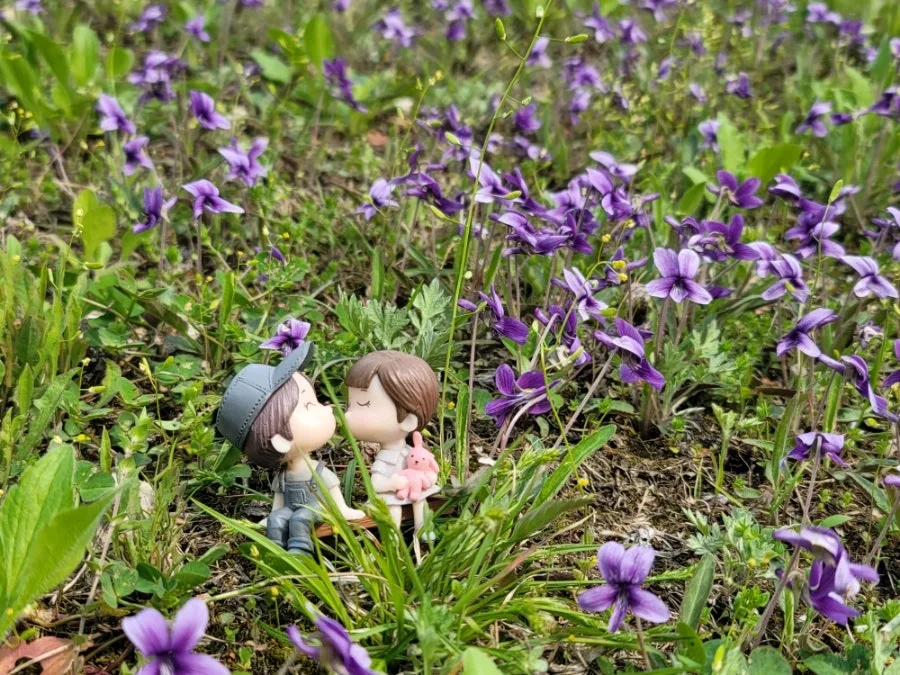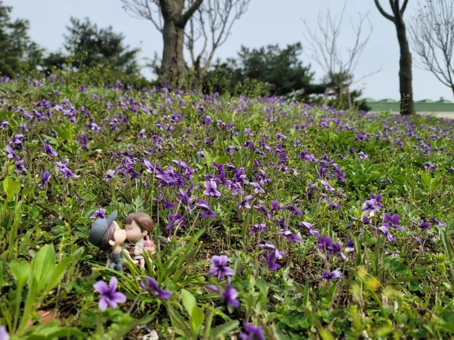 엄마와 통화를 하고 나서 며칠 전 공원 산책에서 보았던 제비꽃이 떠올랐다. 보라색 제비꽃 군락지는 너무도 아름다웠다. 갑자기 사진 놀이가 하고 싶어졌다. 집에서 커플 미니어처를 가지고 나가 보랏빛으로 물든 제비꽃 사이에 두고 한참 사진 놀이를 했다.