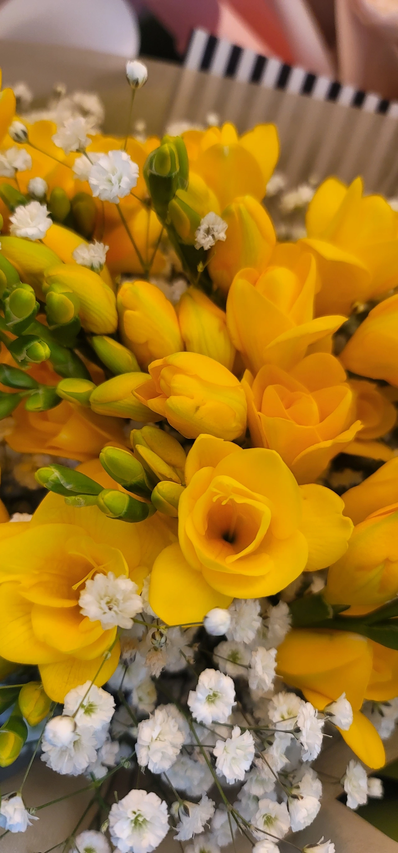 프리지어 꽃말 중 하나가 “새로운 시작”이다. 그래서 졸업식이나 입학식 선물로 많이 찾는다. 꽃이 마른 후에도 화형이 많이 변하지 않아 건조화로 볼 수 있다는 이유와 노란색이 사진을 잘 받는다는 이유도 사랑받는 또 다른 까닭일 듯하다.