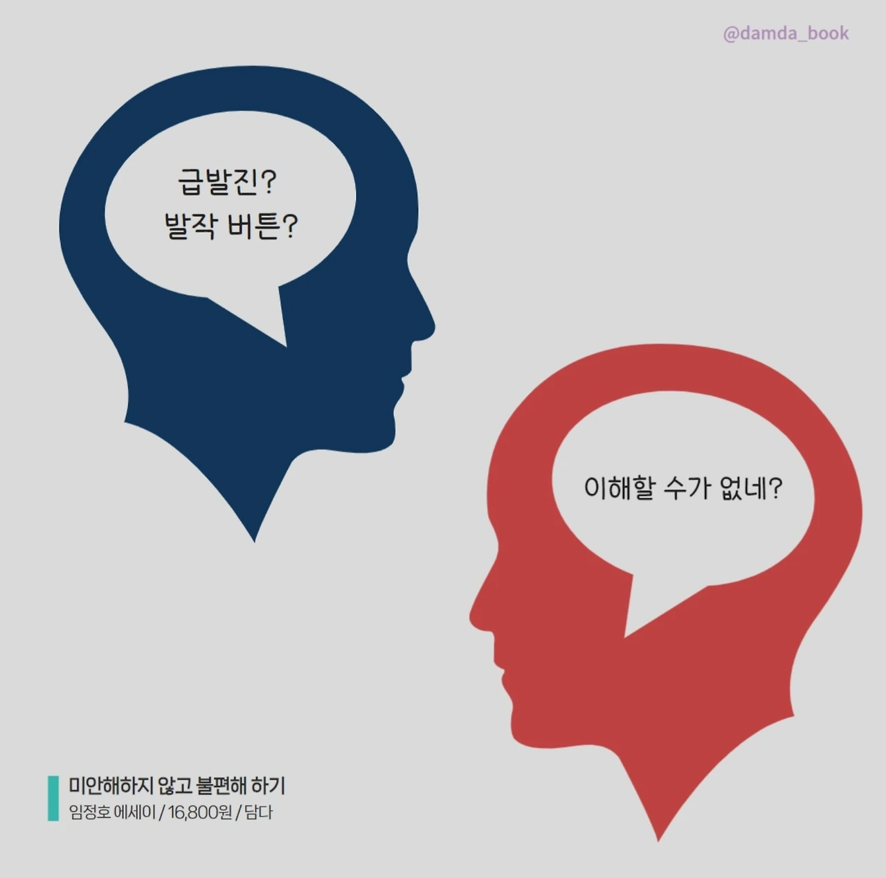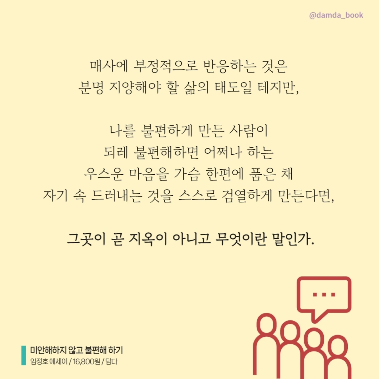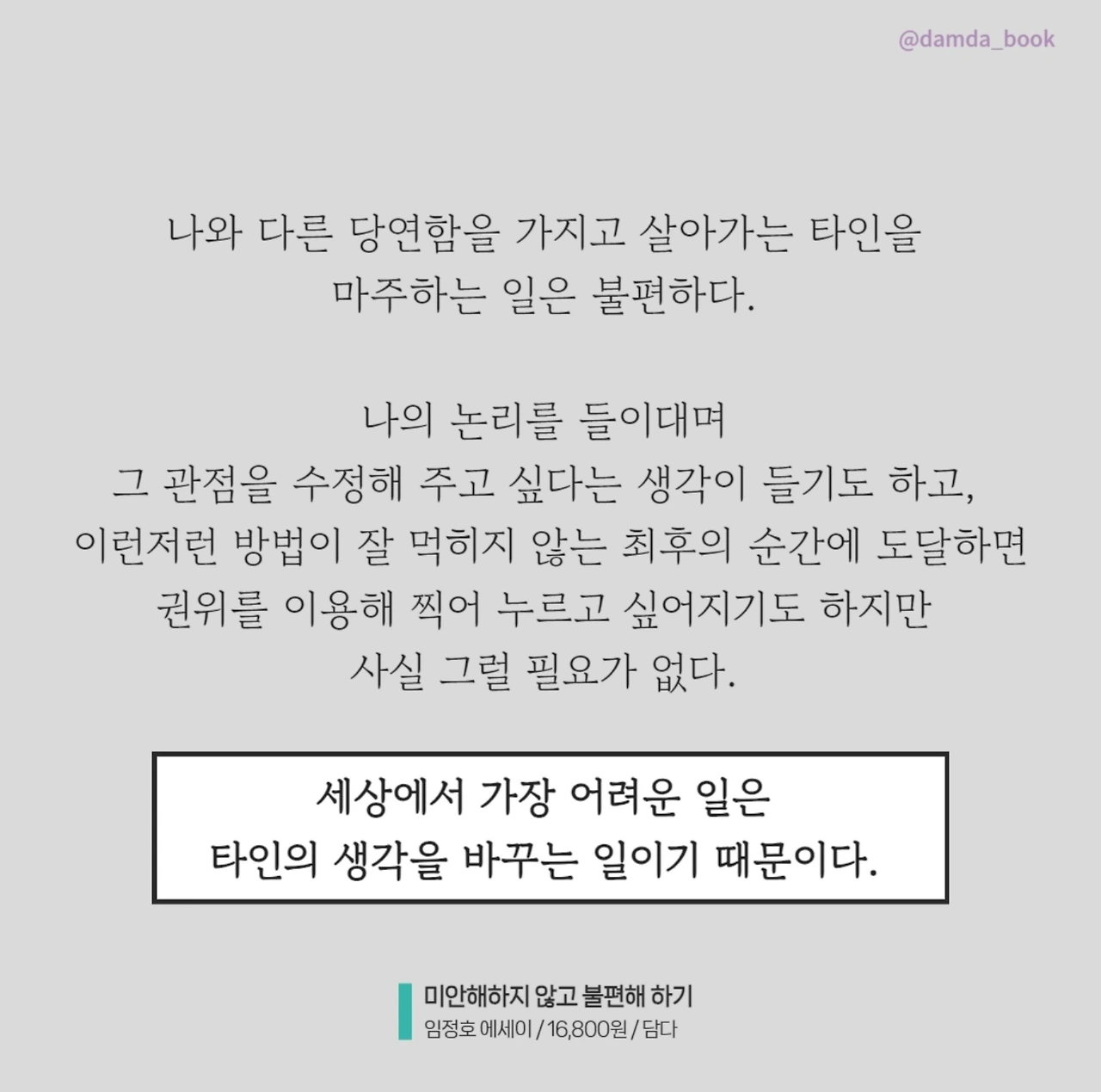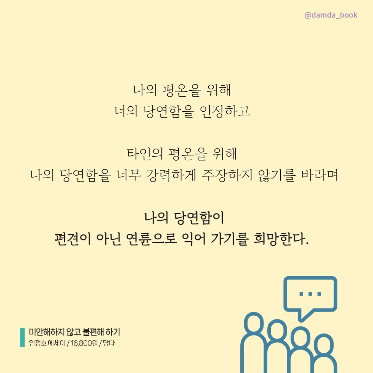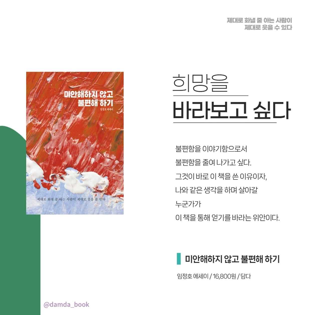 그렇게 스스로를 바라보며 속으로 꽁꽁 싸매어둔 불편한 감정들을 용기 내어 한번 풀어내 봤습니다. 불편함을 억누르며 지내오신 분들! 함께 용기 내서 불편한 것을 불편하다고 외칠 수 있었으면 좋겠습니다. 현재 온라인 서점에서 예약 판매 중인 《미안해하지 않고 불편해 하기》 아낌없는 관심과 응원 부탁드립니다 ^^