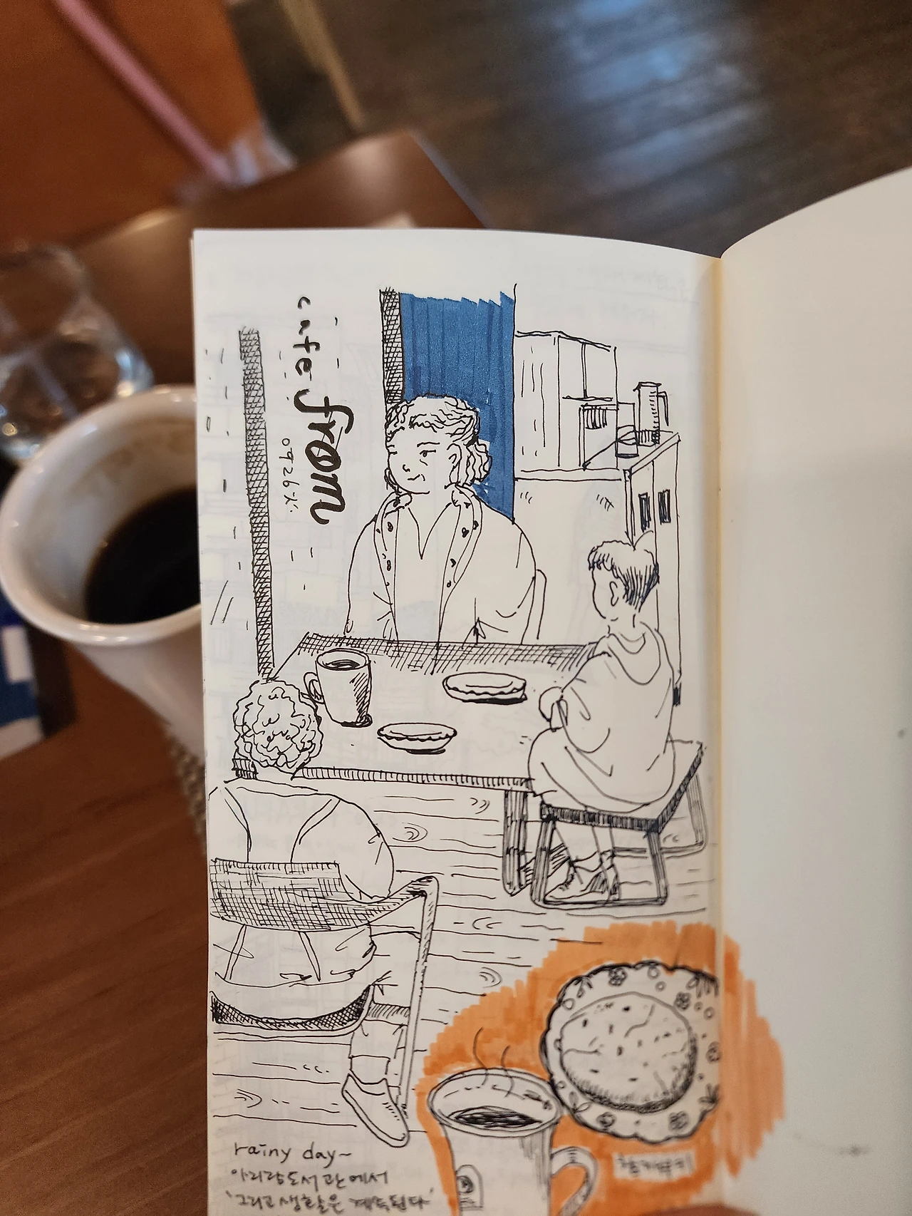 오늘도 카페 안의 풍경을 멍하니 그리고 있으니 명상이라도 한 듯 산만한 정신이 가라앉네요. 이제 간단한 일기를 써야겠어요.
