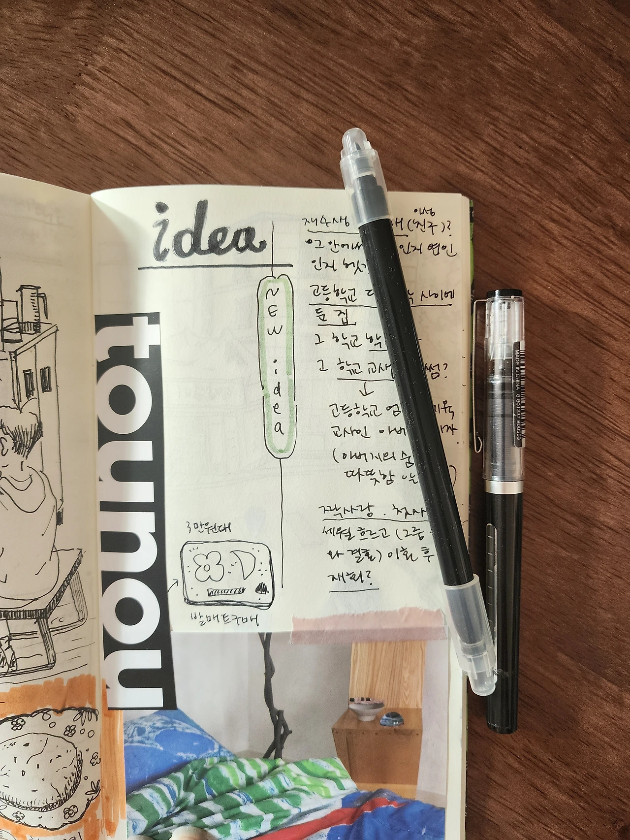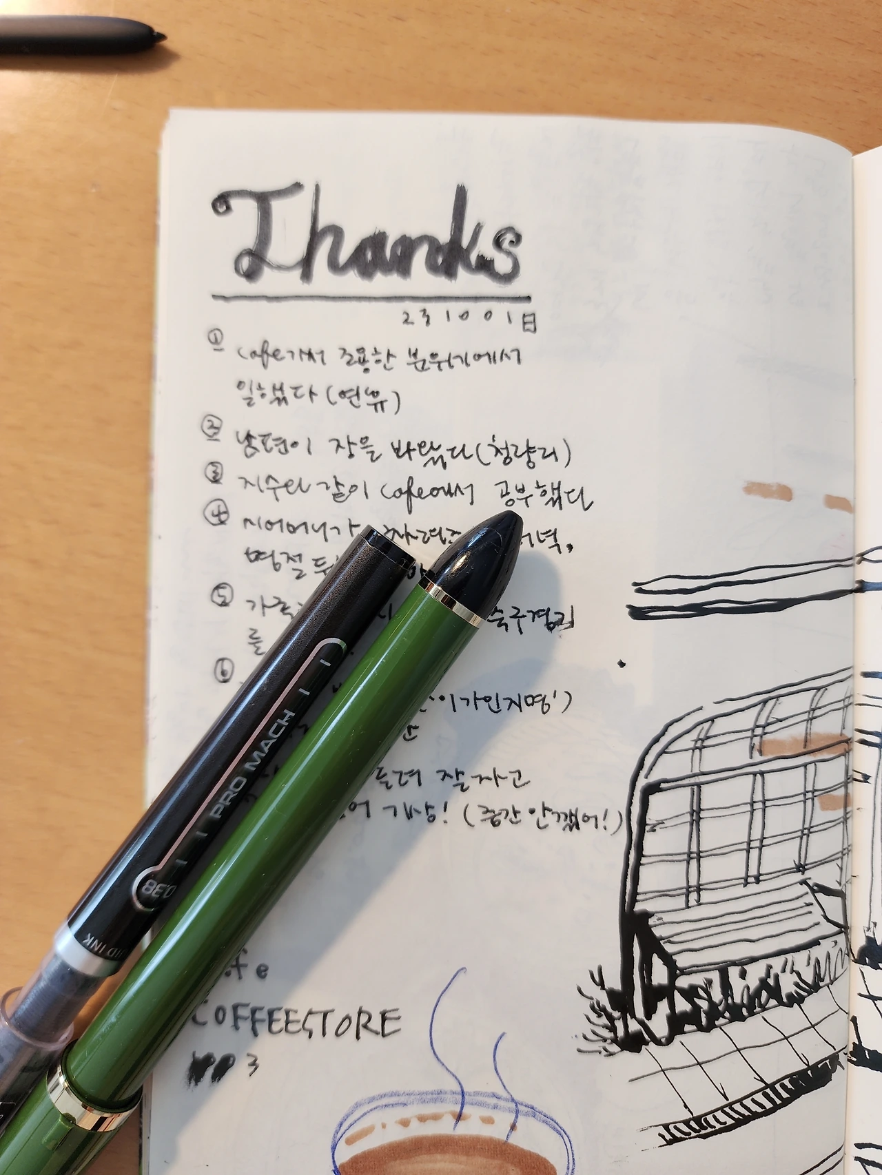제 경우엔 갑자기 떠오르는 아이디어나 감사일기도 한 귀퉁이에 씁니다. 감사일기라기보다 '감사메모'에 가깝지만 매일 쓰려고 했다가 그것조차 강제적으로 느껴져서 그만뒀습니다.