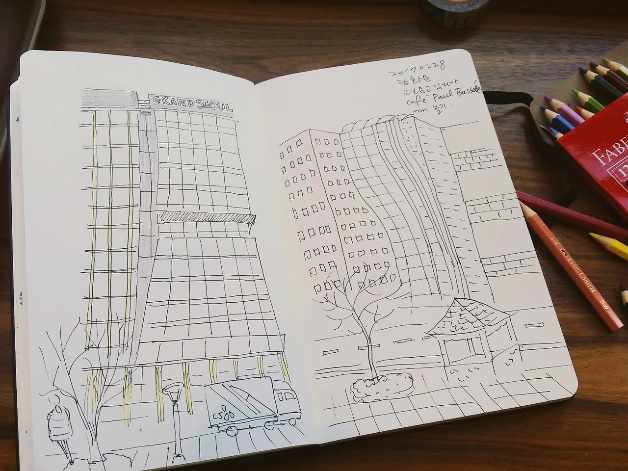 초기에 제가 일기에 그린 그림을 보면 부끄럽기 짝이 없습니다. 저는 이 그림을 광화문 카페에 앉아 보란 듯이 창밖 풍경을 당당하게 그렸었던 기억이 납니다. 참 뻔뻔했죠?