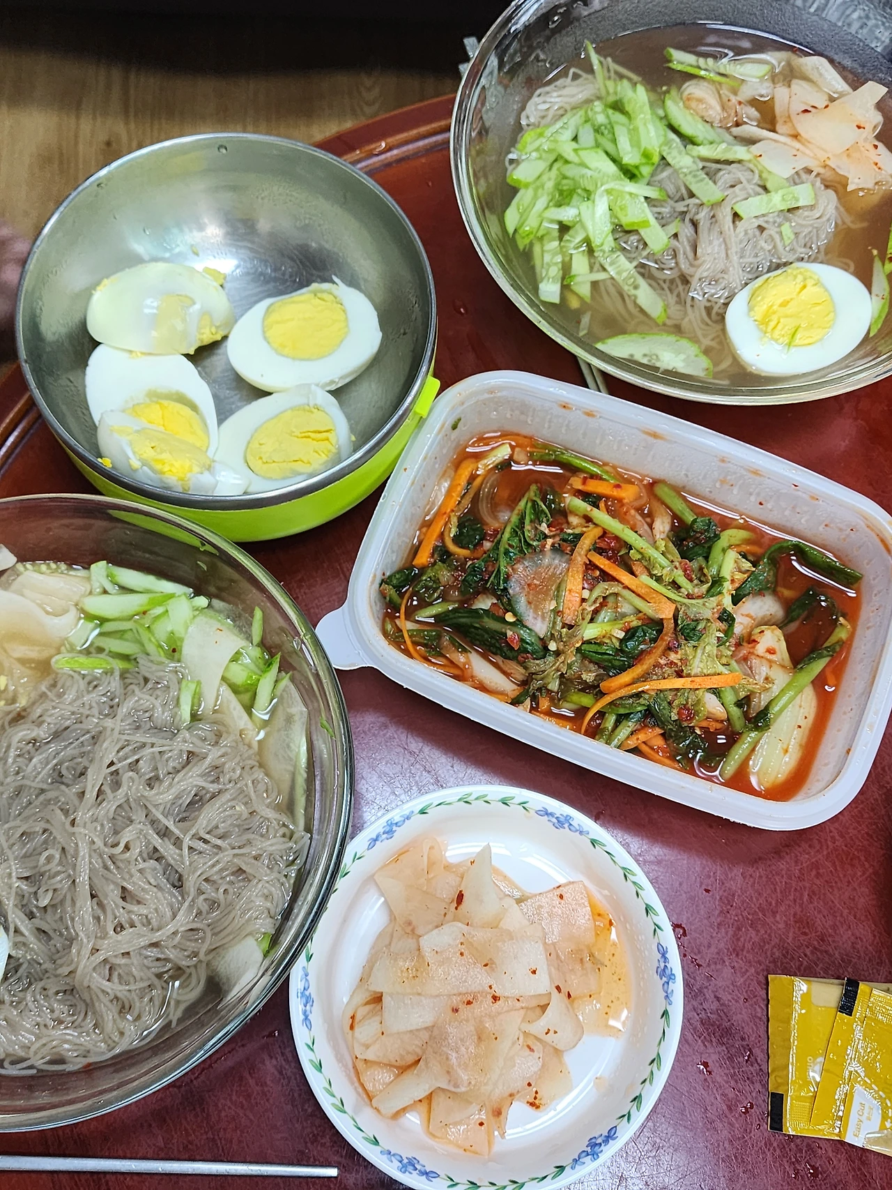 시어머니의 매끄러운 진행을 도우며 냉면을 그릇에 담습니다. 날렵하지 않고 투박하게 잘린 무와 오이를 듬뿍 넣고, 겨자도 한 스푼 넣으면 새콤 시원한 냉면이 완성되지요.