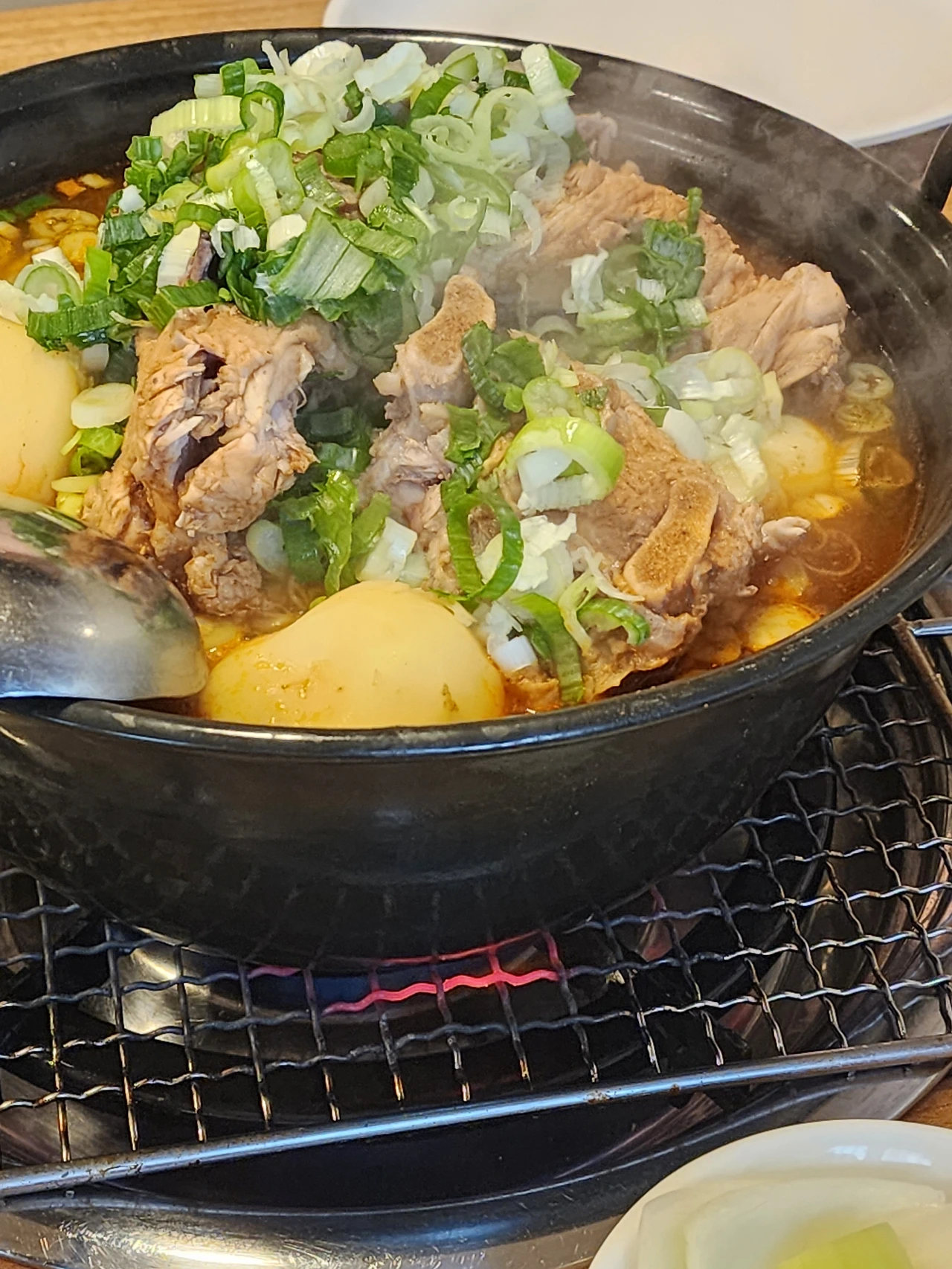 또한 잡내를 잡기 위한 부재료 하나도 없이 파만 넣었는데도 냄새가 안나는 겁니다. 냄새에 예민해서 다른 집에서 감자탕 먹을 땐 약한 잡내를 맡았는데 말이죠.