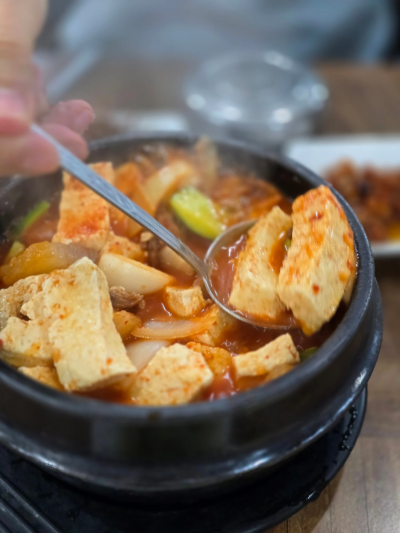 메인으로 나온 뚝배기에 담긴 두부찌개 또한 칼칼하고 얼큰해 금방 몸에 온기가 돌았습니다. 직접 만든 두부로 보이는 두부와 고기 건더기를 밥에 부어 삭삭 긁어먹었더니 남편이 놀라는 겁니다.