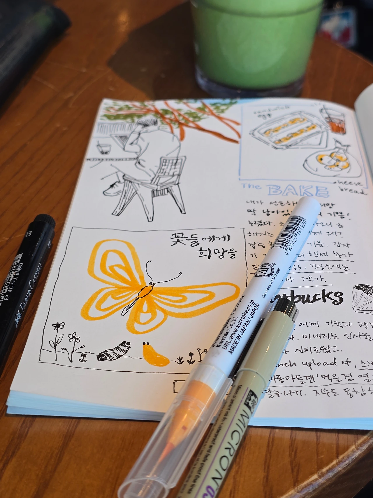 삐뚤삐뚤, 예쁘게 그려야 한다는 강박 없이 아무렇게나 그리고, 옆에 짧은 일기를 썼어요. 재밌었습니다.