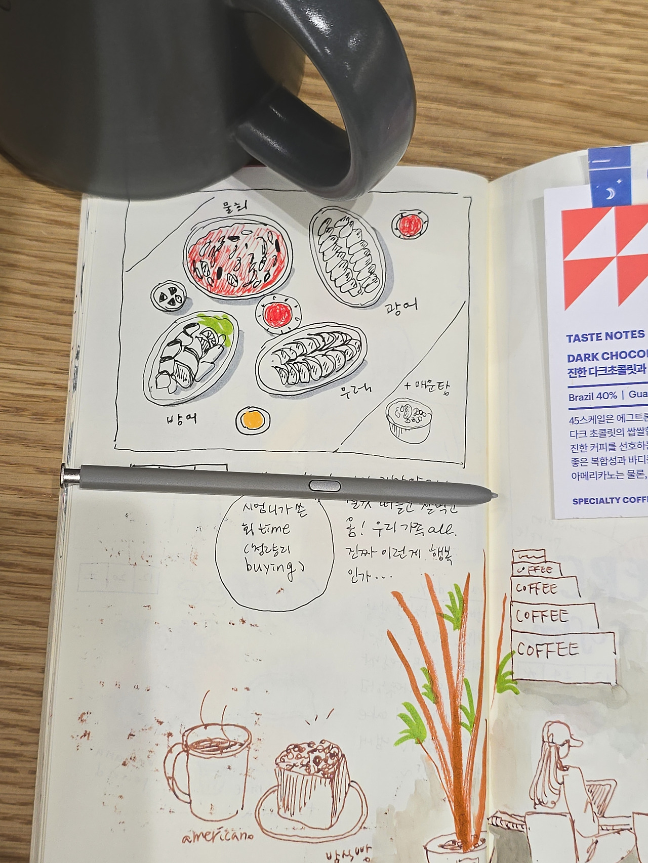 그릇도 모자라고, 먹고 싶은 음식에 손은 안 닿는데, 이상하게도 맛있습니다. 맛이 더 좋은 것 같기도 하고. 누군가가 한마디 하더라고요.