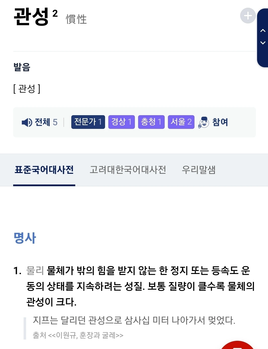 최초로 어떤 힘을 받아 등속도 운동 혹은 정지라는 유지 상태에서 어떤 외부의 힘도 받지 않는 한 지속되려는 성질이 관성이다.