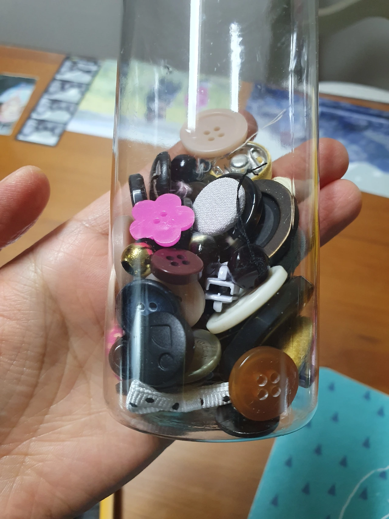 아이들이 마시고 난 투명한 예쁜 플라스틱 통 하나를 남겨 깨끗하게 세척하고 말린 후 중구난방 뒹구는 단추들을 한데 모았다. 새 옷에 달려온 여벌 단추들이 한 곳에 모여졌다. 단추통을 보고 있자니 마음이 따뜻해졌다.