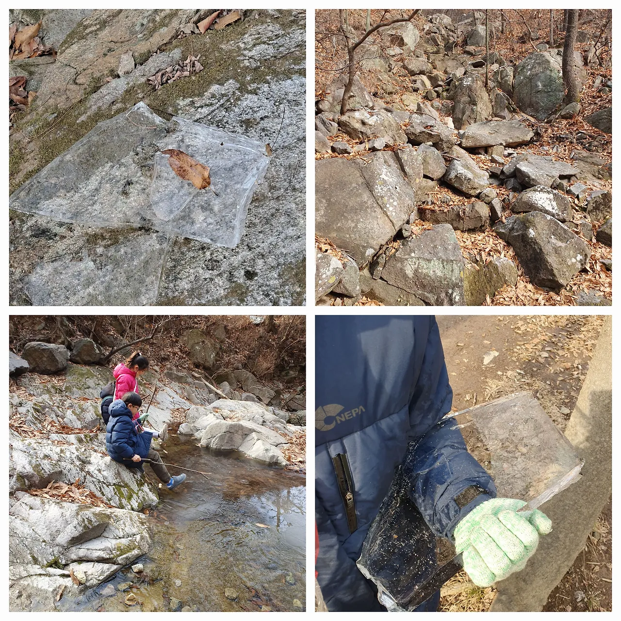 얼음의 두께가 얼마만큼인지 발로 툭툭 건드려 보고 어떡하든 얼음 조각 하나를 건져 손에 쥐고는 소유욕에 집까지 가져가리라 다짐도 한다. 얼음두께가 몇 센티미터인지 어림도 잡아보고 투명한 얼음사이에 낀 얼음화석도 발견해 낸다. 얼음 위에 날카로운 가위 끝으로 조각을 하기도 하는 아이들은 천상 놀이 찾아내기 박사다.