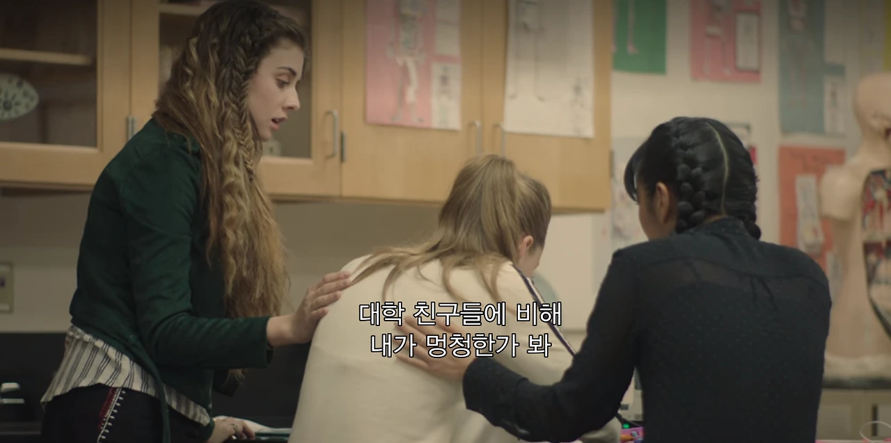 평범한 제이미들이 만들어낸 평가 항목에 베로니카와 시에라는 어떤 영향을 받느냐고? 그들은 버릇처럼 자기를 탓한다. 대학교 1학년 남자친구인 스펜스가 베로니카에게 이별을 고했을 때, 베로니카 첫 마디는 이랬다. “대학친구들에 비해 내가 멍청한 가봐.” 학교 계층사회에서 최상위를 독식하고 있다고 표현했던 베로니카 조차 끊임없이 자기를 탓한다. 보편적으로 퍼뜨려진 여성들의 자가 검열을 그녀도 피할 순 없다. 시에라? 시에라는 자기가 제이미의 텍스팅 상대라는 걸 들키지 않기 위해서 언어 장애인인 척도 했는걸?