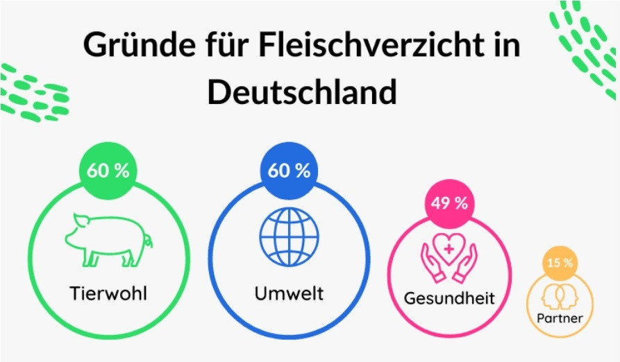 독일 전체에서 통계된 자료를 보면 채식주의자 중 60%가 동물의 복지, 60%는 환경의 이유인데, 세대로 따져보면 전체 채식주의자 중 80%가 30세 미만이다.