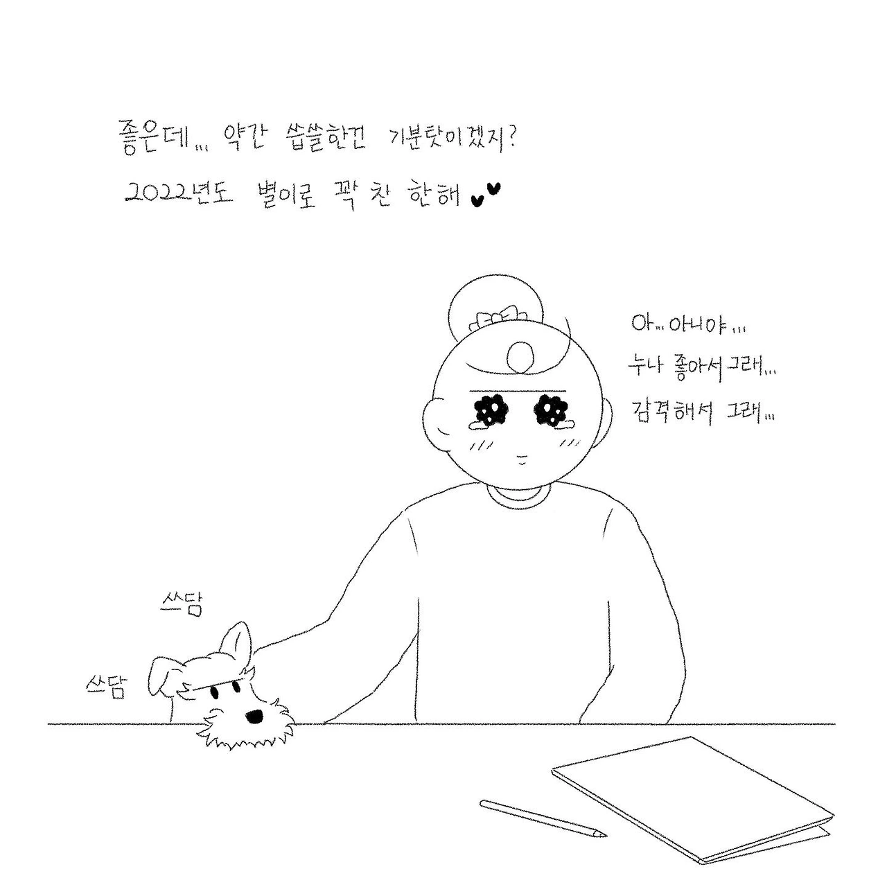 '왜 그렇게 사냐?' 하시는 분들도 계시겠지만... 사실 왜라는 질문에 어떻게 대답해야 될지 잘 모르겠습니다. 그냥 이렇게 살아지더라구요. 굳이 이야기하면 거창해지지만 한 생명에 대한 무의식적인 책임감이랄까요? '나에게 무한한 사랑을 주는 반려견이 조금이라도 편하고 행복하게 지낼 수 있다면...'이라는 생각이 드는 순간 이미 내 모든 일정은 반려견 위주로 돌아가고 있더라구요. 어떻게 생각하면... 무한한 사랑에 당한 것 같아 조금 씁쓸해지기도 합니다(하하하). 저의 2022년은 또 이렇게 무한한 사랑 속 작은 보답을 위해 바삐 흘러갈 듯합니다.
