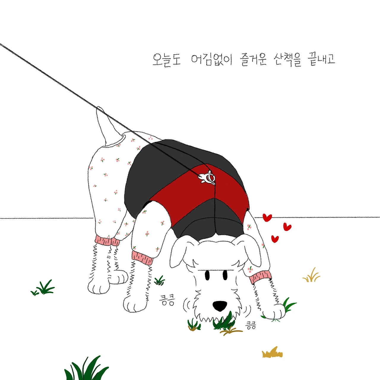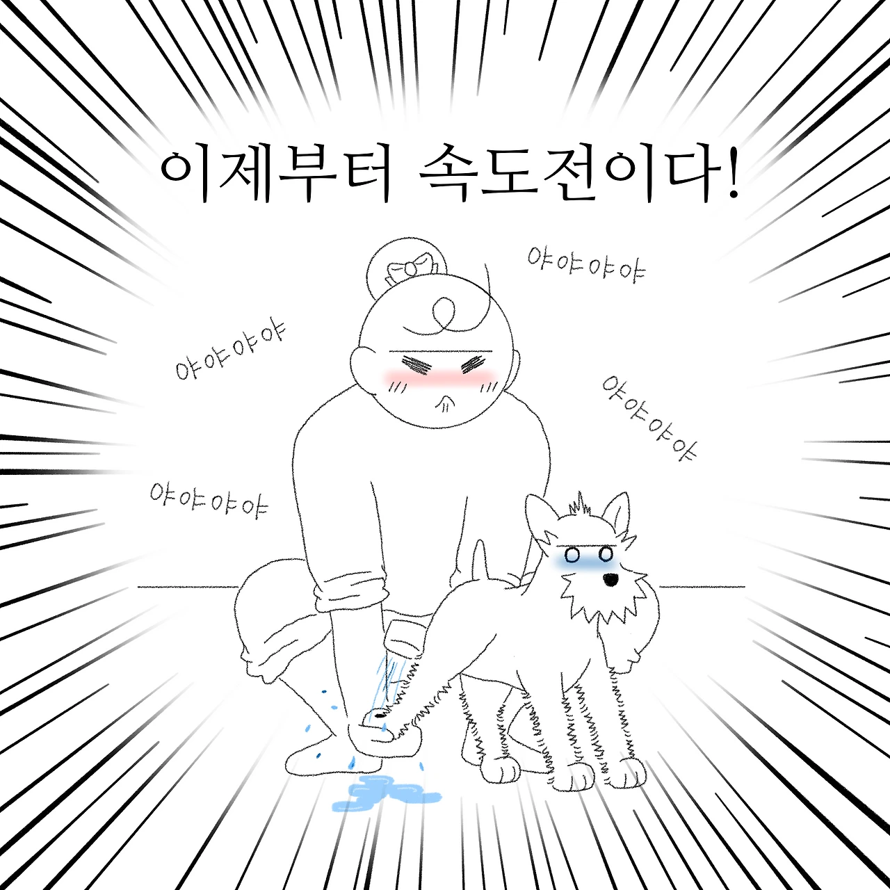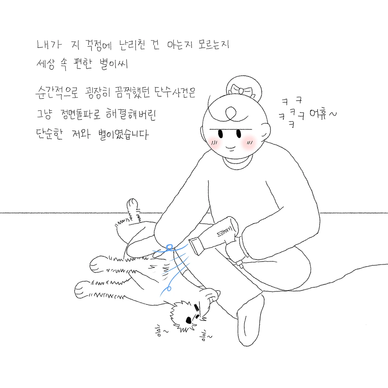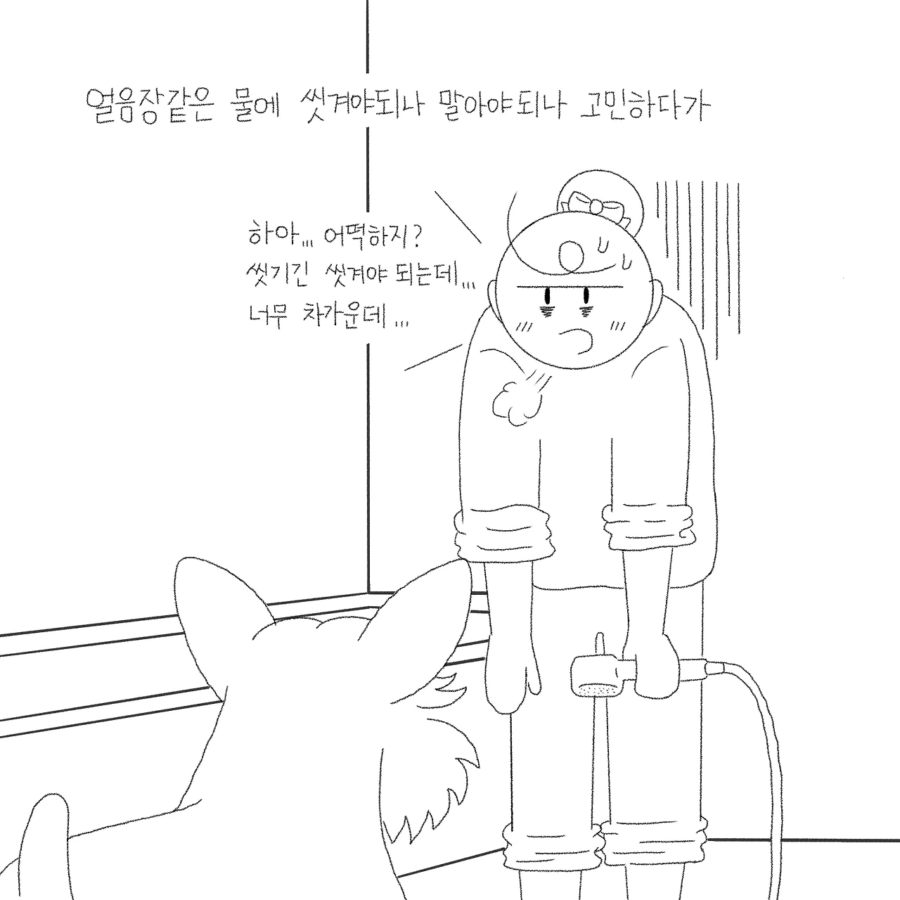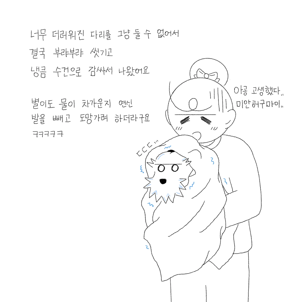 하필 그날 산책을 산으로 다녀온 터라 별이 발이 온통 흙발이어서 안 씻길 수가 없었어요. ‘물을 데울까? 지금 데우면 한 5분 이상 걸릴 텐데…. 별이가 그 시간 동안 기다릴 수 있을까?’ 여러 생각이 오가다가 결국 발만 초 스피드로 씻기고 나가기로 했습니다. 정말 얼음장같이 차가운 물을 어쩔 수 없이 별이 발에 뿌리고 ‘허버버버버, 어구어구’ 등 알 수 없는 해괴한 소리를 내가며 빠르게 씻겨 냉큼 수건으로 감싸고 나왔습니다. 제대로 씻긴 건지 모르겠지만 우선 나가야 했습니다. 평소에 잘 씻는 별이도 차가운 물은 견딜 수 없었는지 안 씻으려 발 빼고 도망가고 난리도 아니었거든요. 나와서 따뜻한 드라이기로 마무리하고 이불을 쏙 덮고서야 마무리되었습니다.