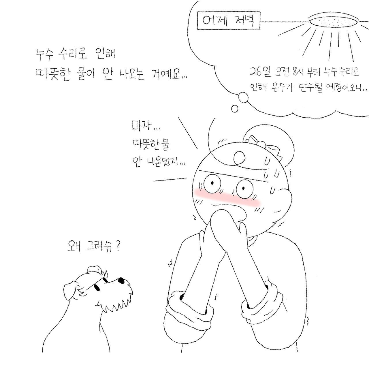 그날도 즐겁게 산책을 하고 돌아와 발을 씻기려고 목욕탕에 들어갔는데 따뜻한 물이 나오지 않는 거예요. 그 전날 들은 방송은 까맣게 잊고 ‘이거 왜 이래?’를 연신 외치며 이리저리 원인을 찾아왔다 갔다 거렸죠. 별이도 어리둥절해하며 목욕탕에서 이러지도 못하고 저러지도 못하고 저만 쳐다보고 있었습니다. 그 순간 문득 방송이 떠오르면서 단수되는 시간대가 별이 산책 다녀온 시간에 겹치는 걸 그제야 깨닫고 말았습니다. 온수 쓸 일이 없다며 흘려들었던 과거의 나… 왜 그랬니?…