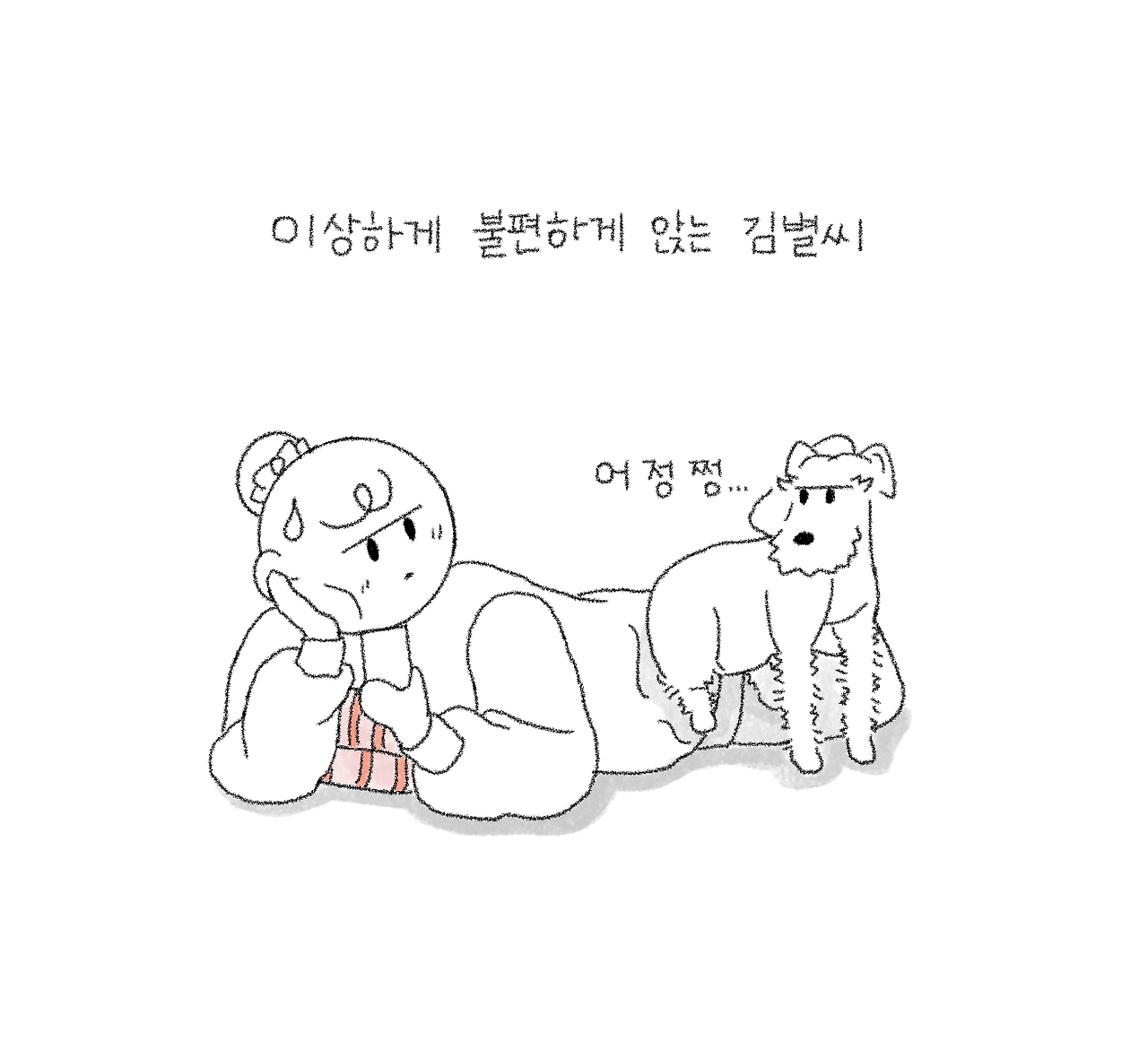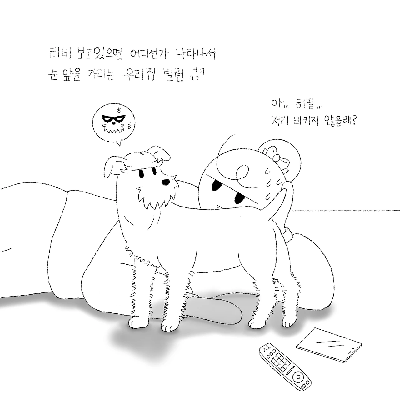 티비를 시청하고 있으면 어디선가 나타나서 얼굴 앞을 가리는 우리 집 빌런. 옆에 잘 앉아 있다가도 갑자기 일어나 얼굴 쪽으로 다가와 내 모든 시야를 가린다. 가끔은 엉덩이를 바로 눈앞에 가져다 놓을 때가 있는데 뜻밖에 아찔한 엉덩이 뷰에 어이없는 웃음이 터지곤 한다. 자기의 존재감을 강하게 알리고 싶어서 그러는 걸까?