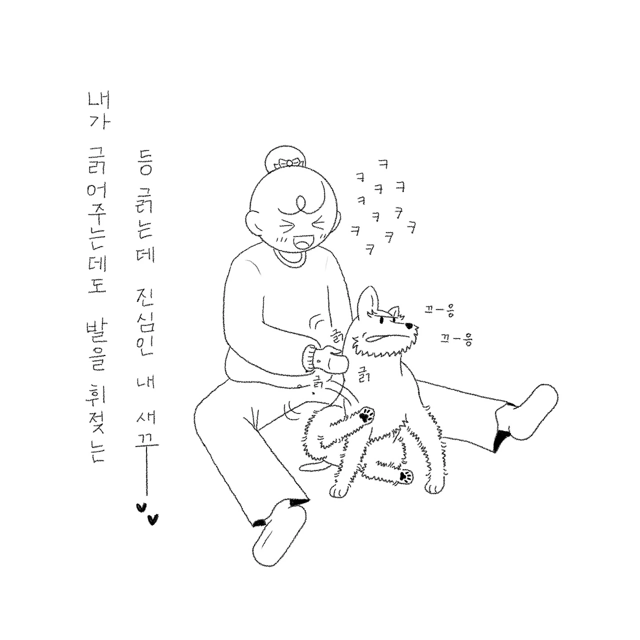 누가 등 긁어 주면 그렇게 시원하고 행복할 수가 없듯 반려견도 그런가 보다. 반려견의 경우 등에 손이 닿지 않으니 종종 등을 긁어주곤 하는데 분명 내가 긁고 있는데도 발을 파닥파닥 거리며 다리로 긁는 시늉을 한다. 등을 긁으면 나오는 본능적인 움직임이겠지만 그 모습이 너무 어이없기도 하고 귀엽고 우습기만 하다. 별아... 누나가 긁어줄게... 너는 그냥 즐겨...