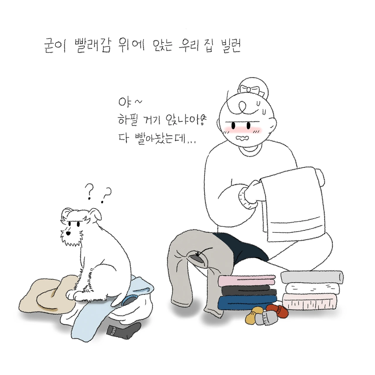 깨끗하게 빨래를 하고 개려고 할 때 어김없이 어디선가 우리 집 빌런이 나타난다. 잠깐이라도 한눈을 팔면 그 찰나에 빨랫감 위에 앉아 있는 별이. '왜 저러나...'싶기도 한데 이유를 말해주지 않으니 답답할 따름. 포근한 침대, 이불 다 놔두고 꼭 빨랫감 위에 앉는 내 반려견의 심리는 대체 뭘까?