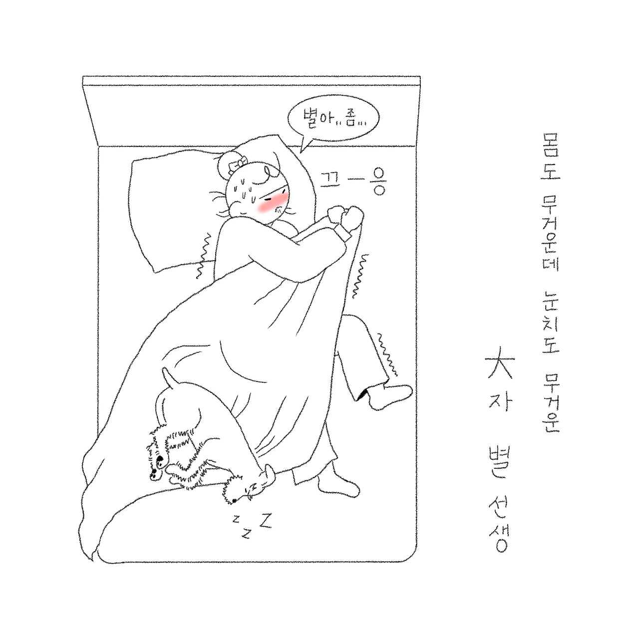 별이는 침대에서 같이 잠을 잔다. 그럼 어디 한편에서 자리를 잡고 잠들어 주면 좋겠는데 꼭 한가운데 그것도 가로로 심지어 큰 대자로 누워 침대의 대부분을 차지해버리는 별. 게다가 이불 위에 누워있으면 무거워서 이불을 댕기기도 쉽지가 않다. 가끔 일부러 그러는 것 같아 양심이 있나... 싶기도 한다. 결국 오늘도 구석에 누워 겨우 덮은 이불을 붙잡고 잠이 든다.