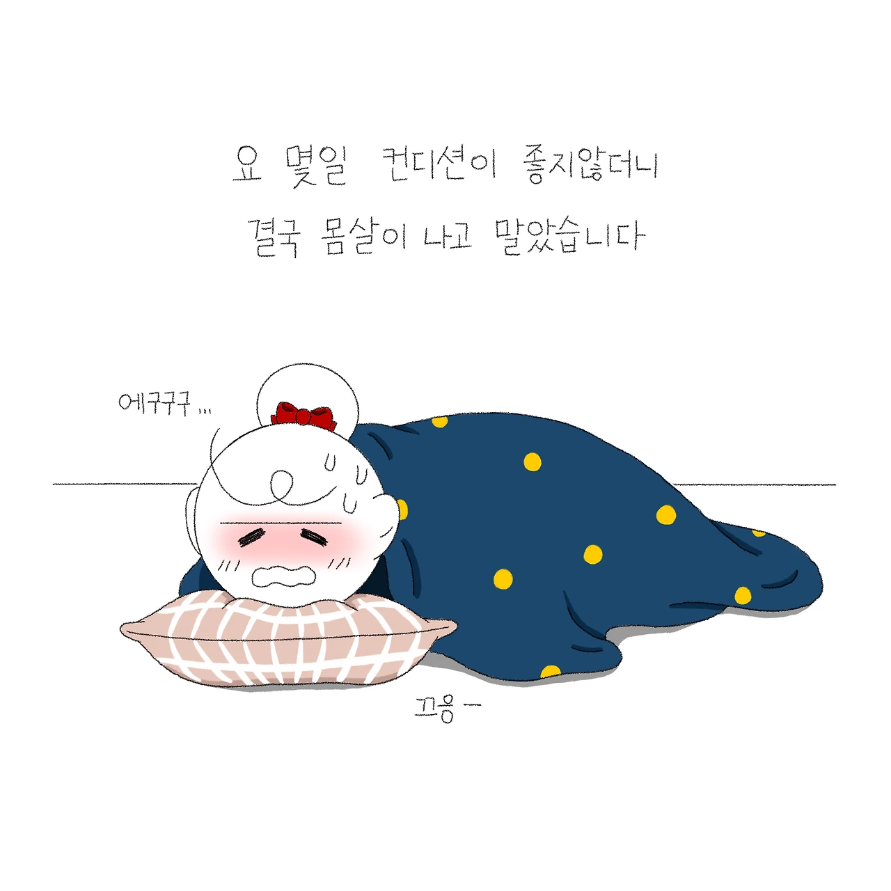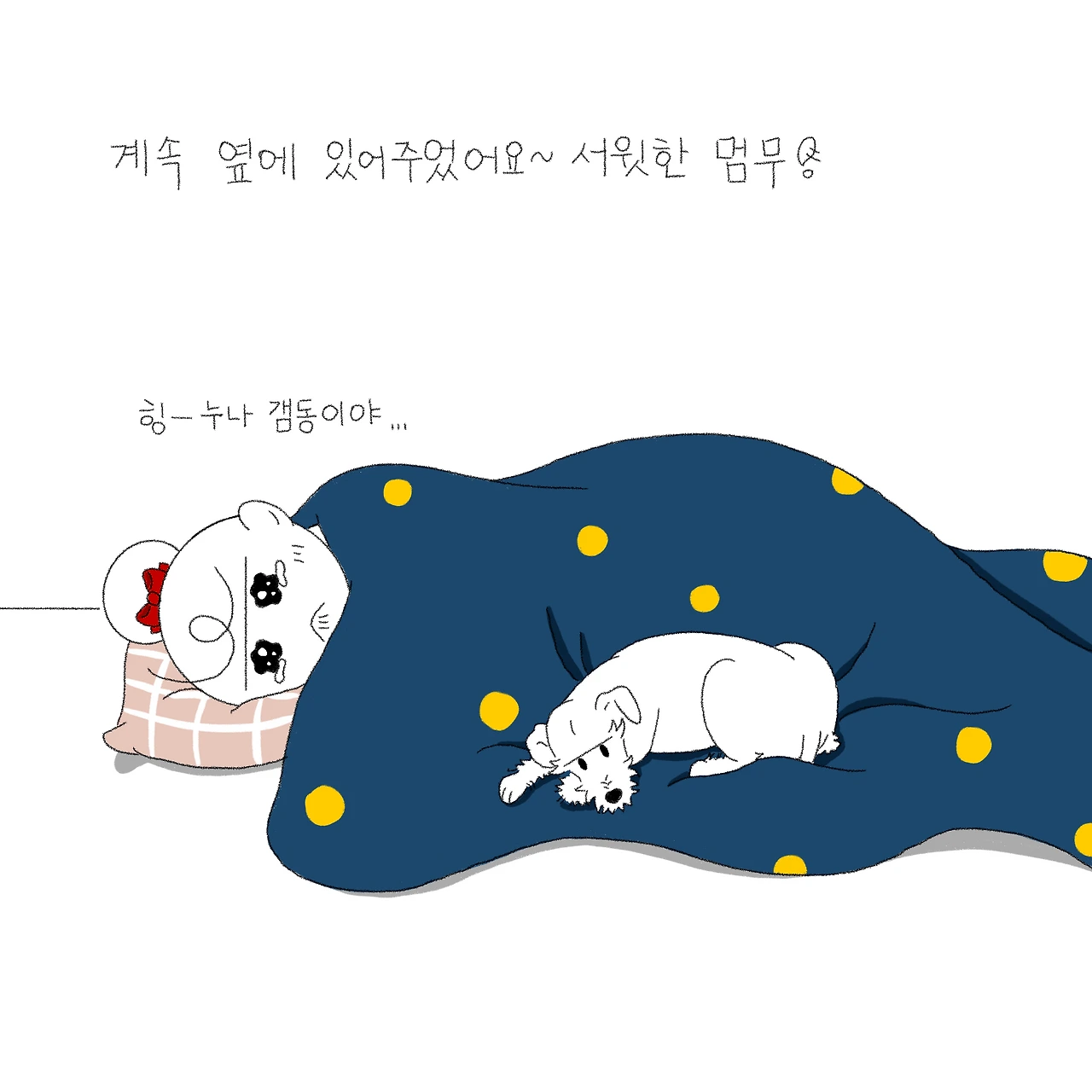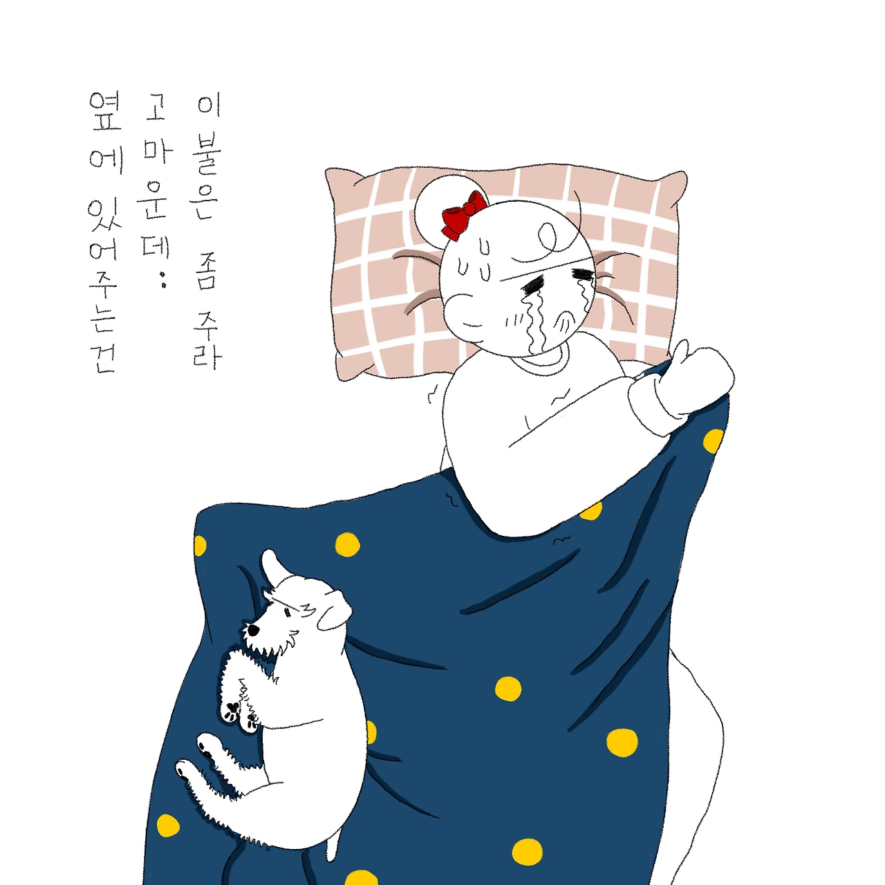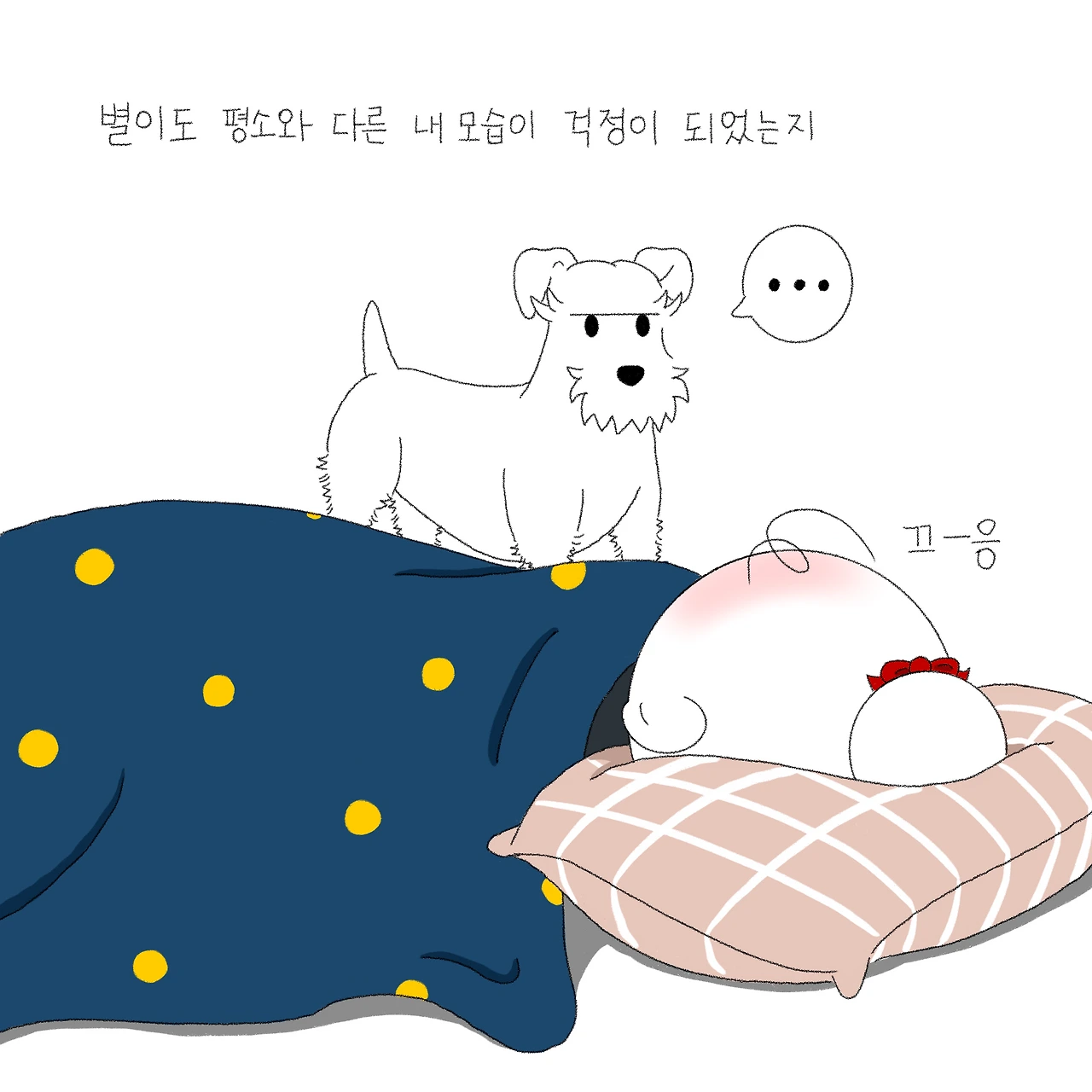 그런 아픔과 우울에 사로잡혀 있는 저에게 '타박타박' 바닥을 밟은 별이의 발소리가 어렴풋이 들려옵니다. 어느샌가 옆에 다가와 저를 지긋이 쳐다보는 별이의 눈빛과 별이의 입김이 봄볕처럼 따뜻하게 느껴집니다. 평소와 다른 제 모습에 별이도 신경 쓰이는지 한참을 쳐다보다 옆 자리에 살포시 자리 잡습니다. 별이가 누우면서 당겨진 이불의 무게감이 기분 좋습니다. 큰 존재감. '혼자가 아니야' 라며 말을 걸어주는 듯한 온기. 순식간에 옅은 미소를 짙게 만드는 행복감. 별이로 채워진 따뜻함으로 신기하리만치 아픈 몸과 마음이 가벼워집니다. 마치 엄마 손은 약손인 것처럼...