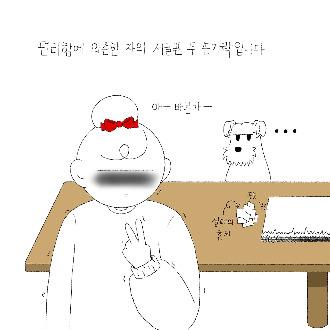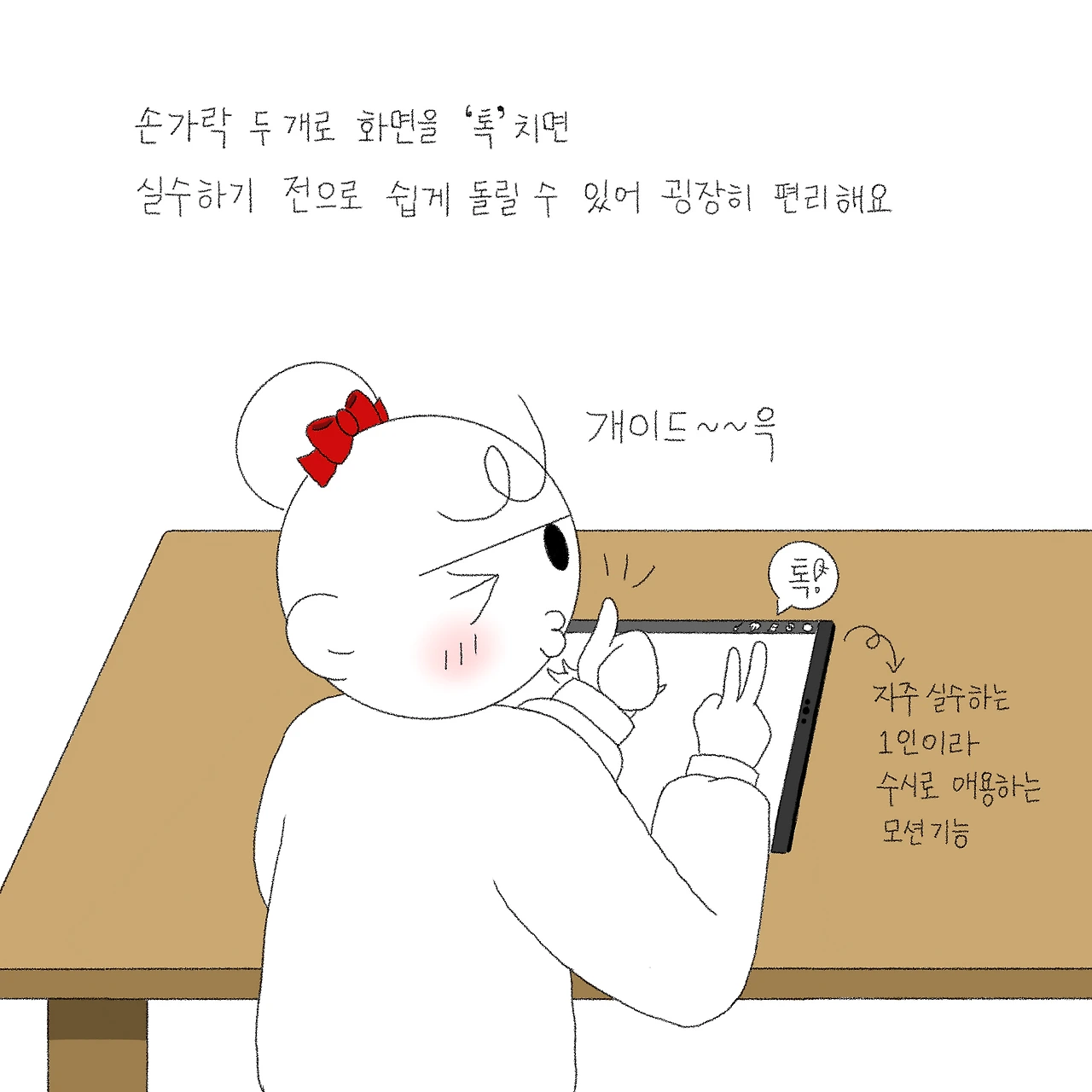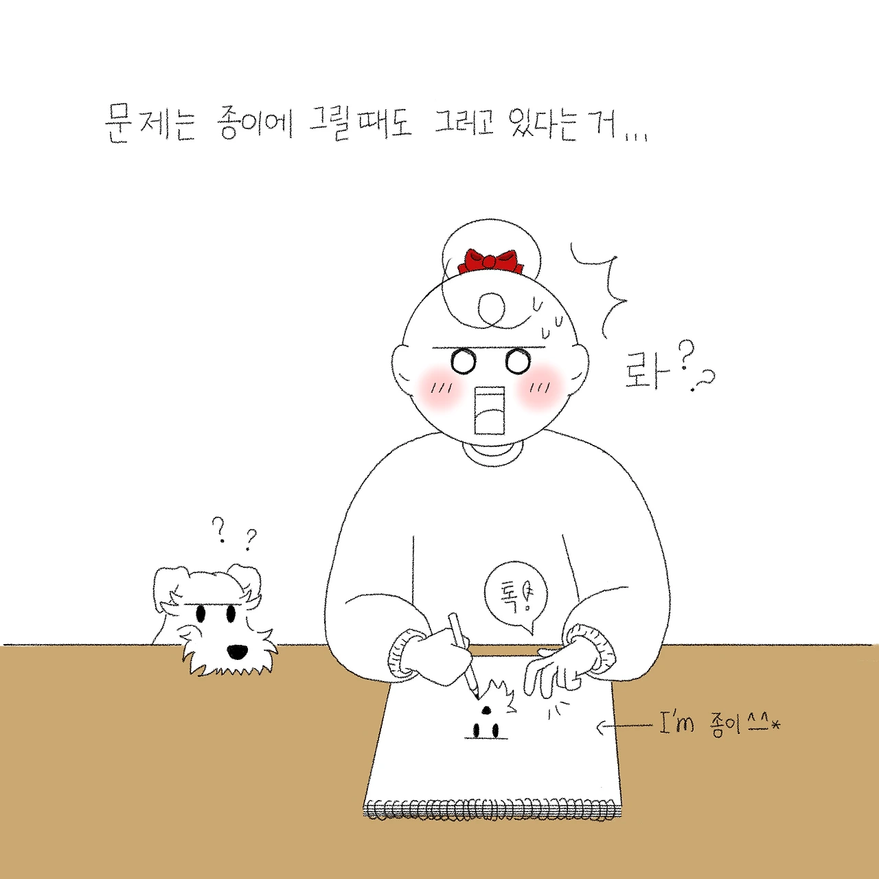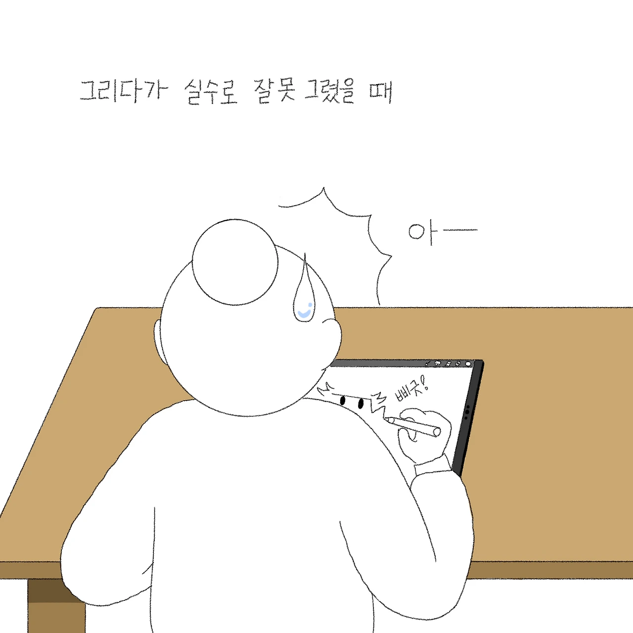 하지만 습관은 참 무서운 거 같아요. 한 번은 종이에 그림을 그릴 일이 있었는데, 프로크리에이트로 그리던 게 손에 익어 신중하게 그리지 않고 쉽게 쓰윽 그리고 실수하니 저도 모르게 손으로 툭툭 종이를 건드리고 있더라구요. 하하하. 혼자 있어도 밀려오는 민망함이란...