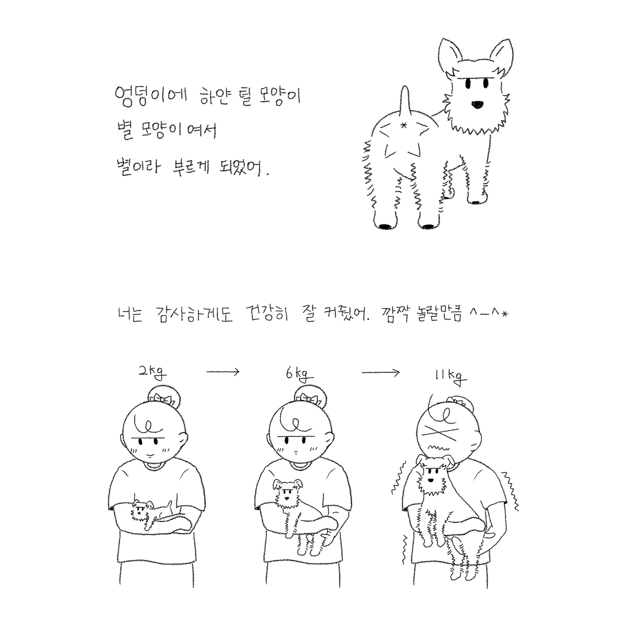 이름을 짓는 건 참 어려운 일이었다. 처음엔 '사랑이, 깜이, 똘이..'등등 강아지스러운 귀여운 이름들이 우수수 나왔지만 마음에 꼭 와닿는 이름이 나오지 않았다. 그러다 무심코 별이를 봤는데 까만 털 사이로 유독 엉덩이 털이 하얬는데 그 모양이 딱 별 모양인 것이 아닌가? 그래서 별이가 되었다는 생각보다 하찮고 귀여운 이야기이다. 그렇지만 이름이 지어진 그 순간부터 별이라는 존재가 내려와 내 가슴에 꽂히기 시작했다. 지금은 별이가 아니고서는 별이 될 수 없을 만큼...