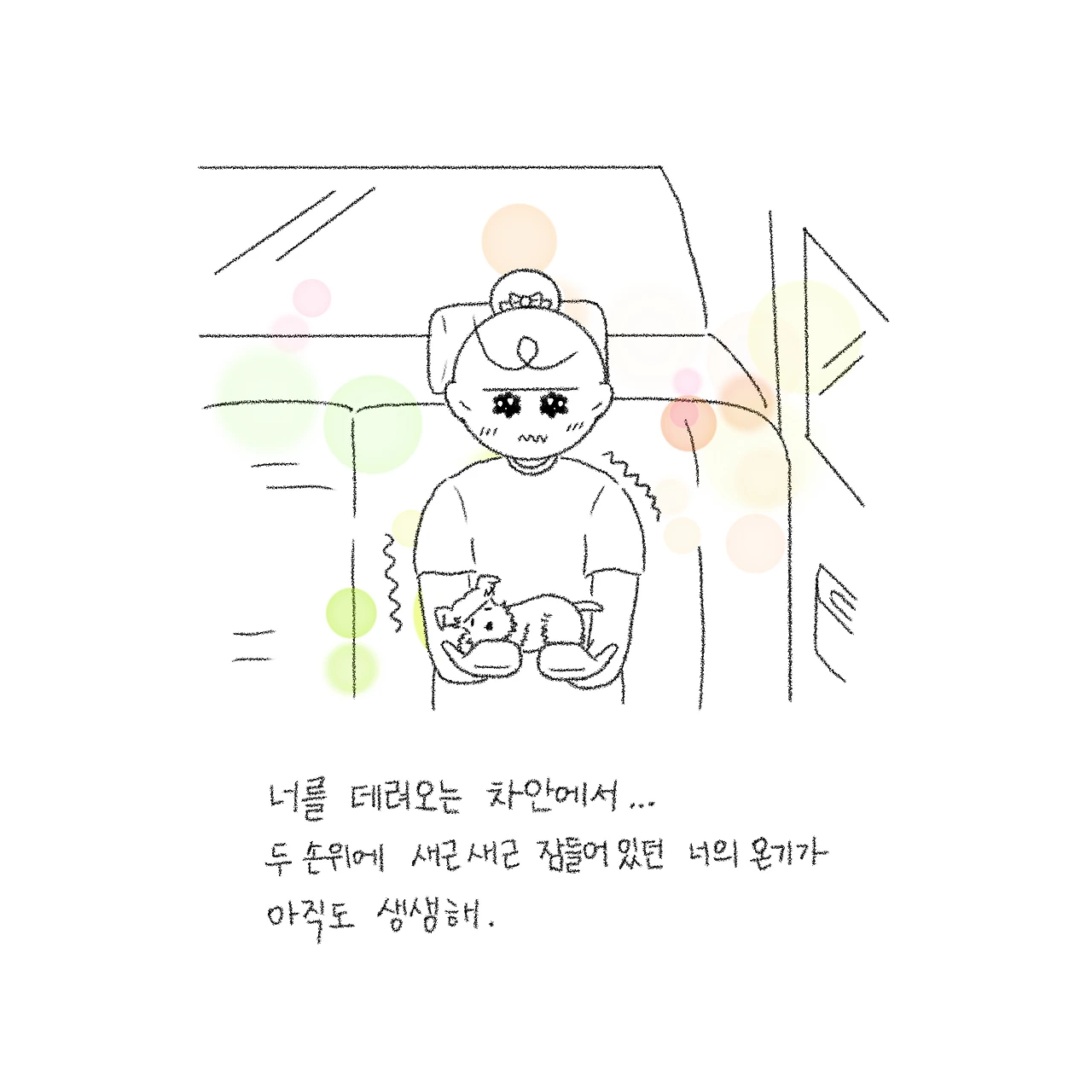 별이를 데려오던 그때는 지금도 생생하다. 양손에 쏙 들어올 만큼 작디작은 생명체. 새삼 초보 보호자 아니랄까 봐 어쩔 줄 몰라하던 상태로 차 뒷좌석에서 별이를 내 양손에 올려놓고 차가 흔들려 놀라지 않도록 최대한 팔을 고정시켜 집으로 가는 내내 쥐가 날 정도로 아파도 내색하지 않고 집까지 갔다. 내 손바닥에 올라와 자고 있는 별이를 보니 그제야 실감이 나 콧구멍은 벌렁벌렁하고 올라가는 입꼬리는 주체가 안되더라. 그 서툰 손 위에서 앞으로 벌어질 일은 하나도 모르는 채 그저 새근새근 잠들어 있던 아기 별이의 모습과 그 온기를 생각하면 아직도 뭉클하다.