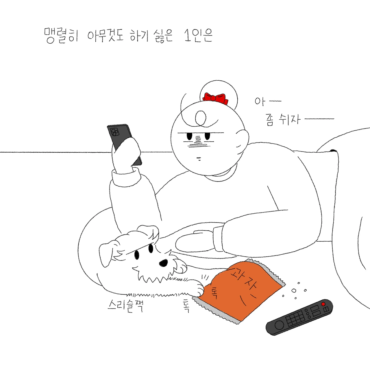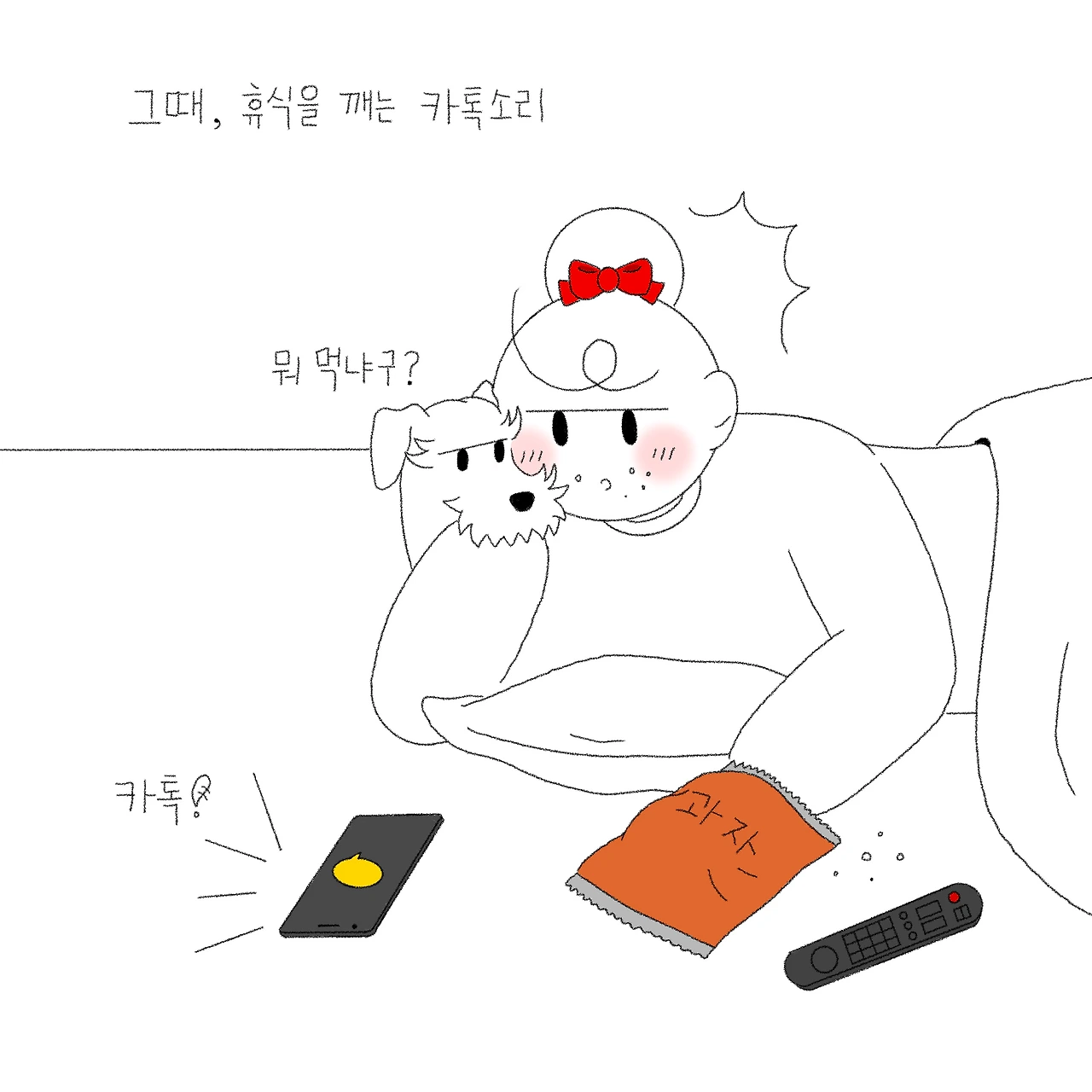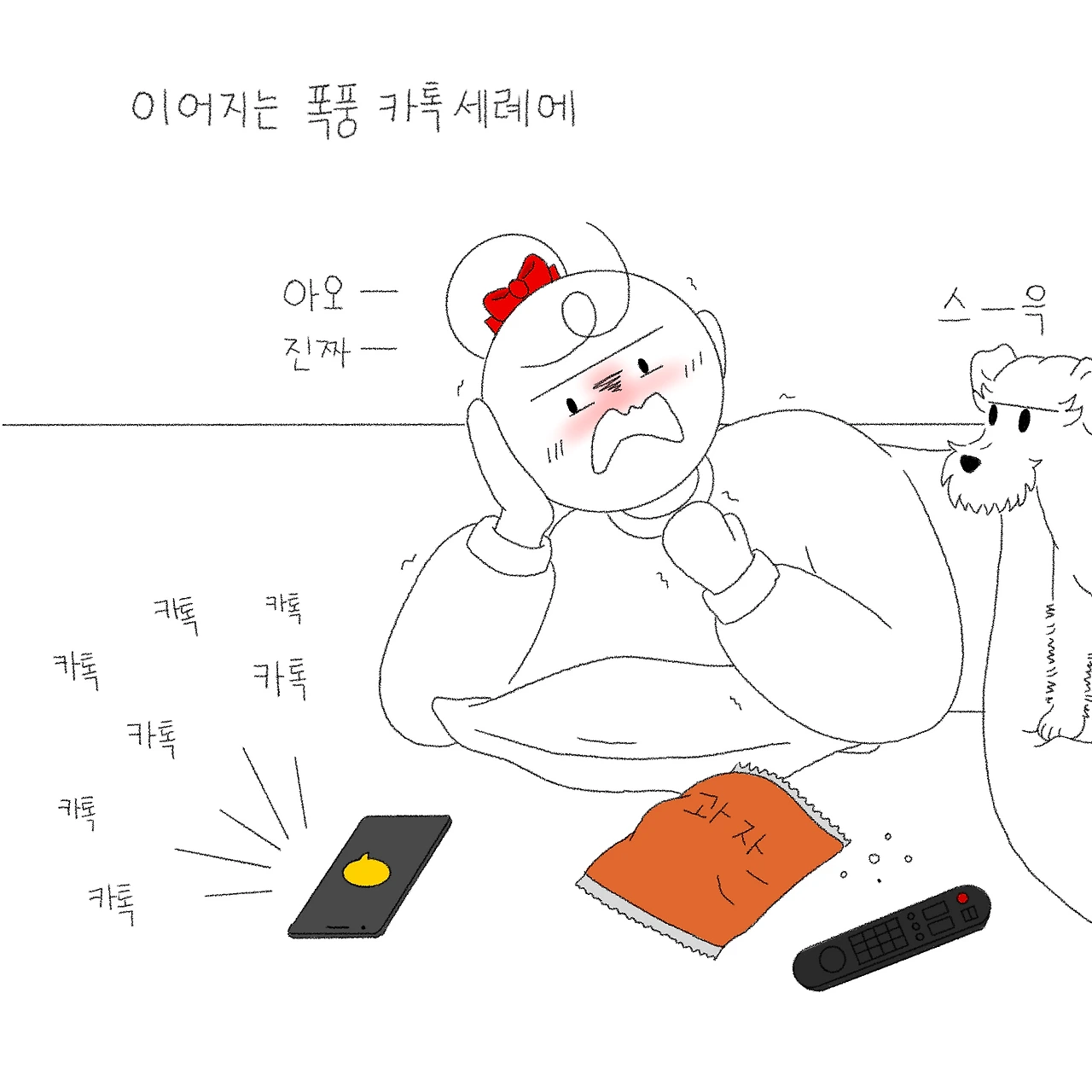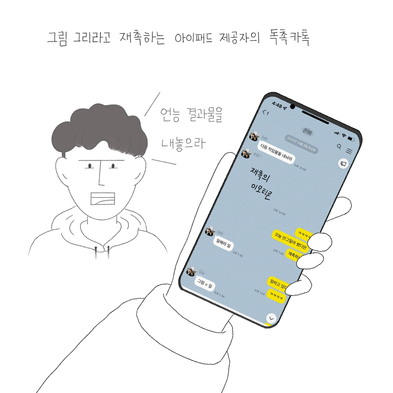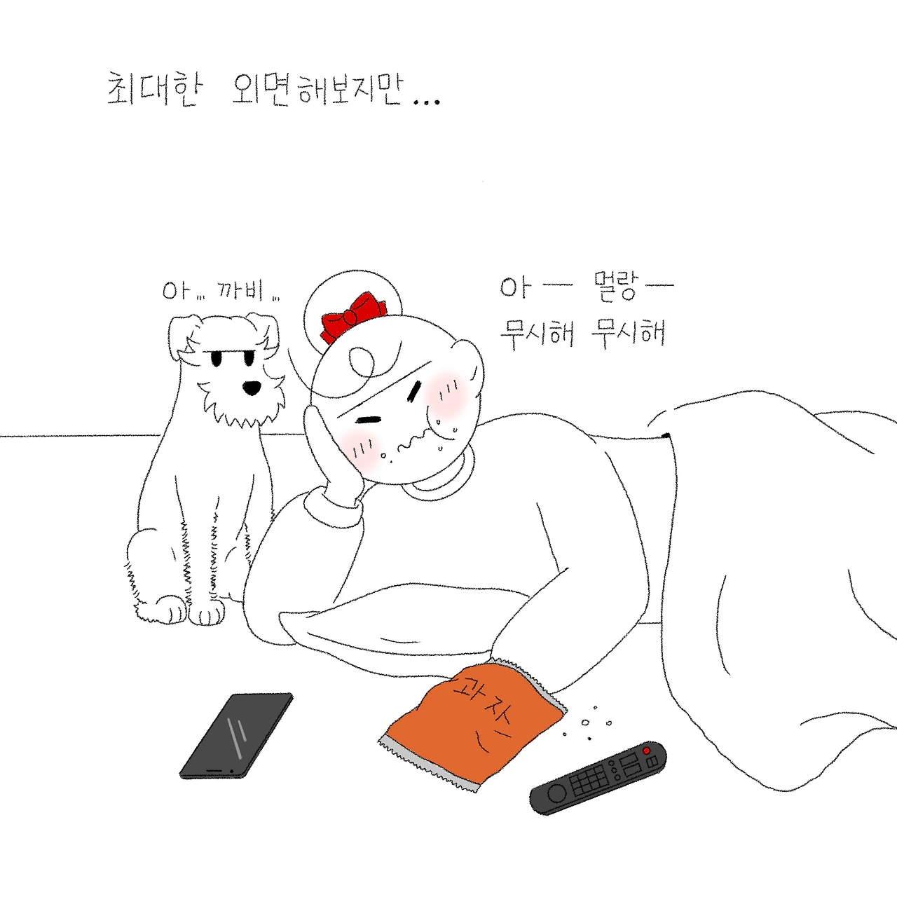 하지만 그렇게 매일을 하다 보니... 하루정도 쉬기가 쉽지 않습니다. 소재가 떠오르지 않거나 유독 아무것도 하기 싫은 날이 누구나 있잖아요? 그렇지만 그런 날도 괜히 눈치가 보이기 시작했습니다. 마치 마감을 재촉당하는 진짜 작가처럼 매일 알게 모르게 독촉을 받는 것 같습니다. 실제로 남동생은 메신저로 그림을 보여달라 성화를 부릴 때가 많습니다. 애써 외면해보지만 결국 아이패드를 붙잡고 뭘 그릴지 고민하고 있더라구요. '아... 이틀에 한 번씩 올릴 걸...'라며 뒤늦은 후회를 해봅니다. 하하하.