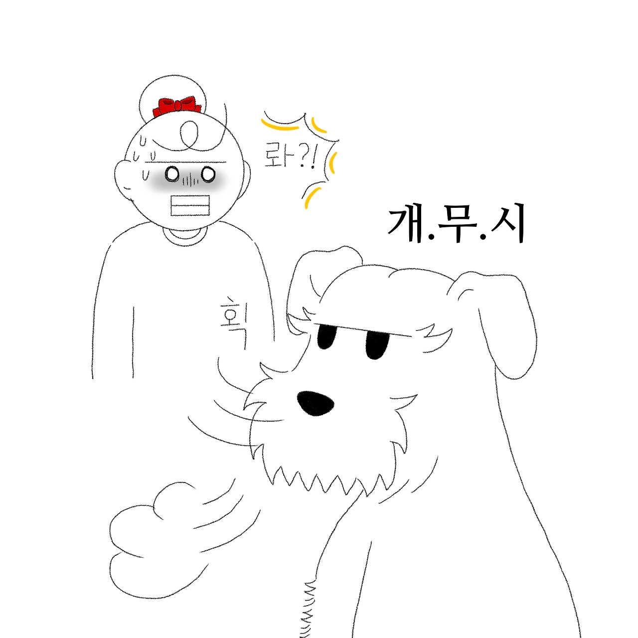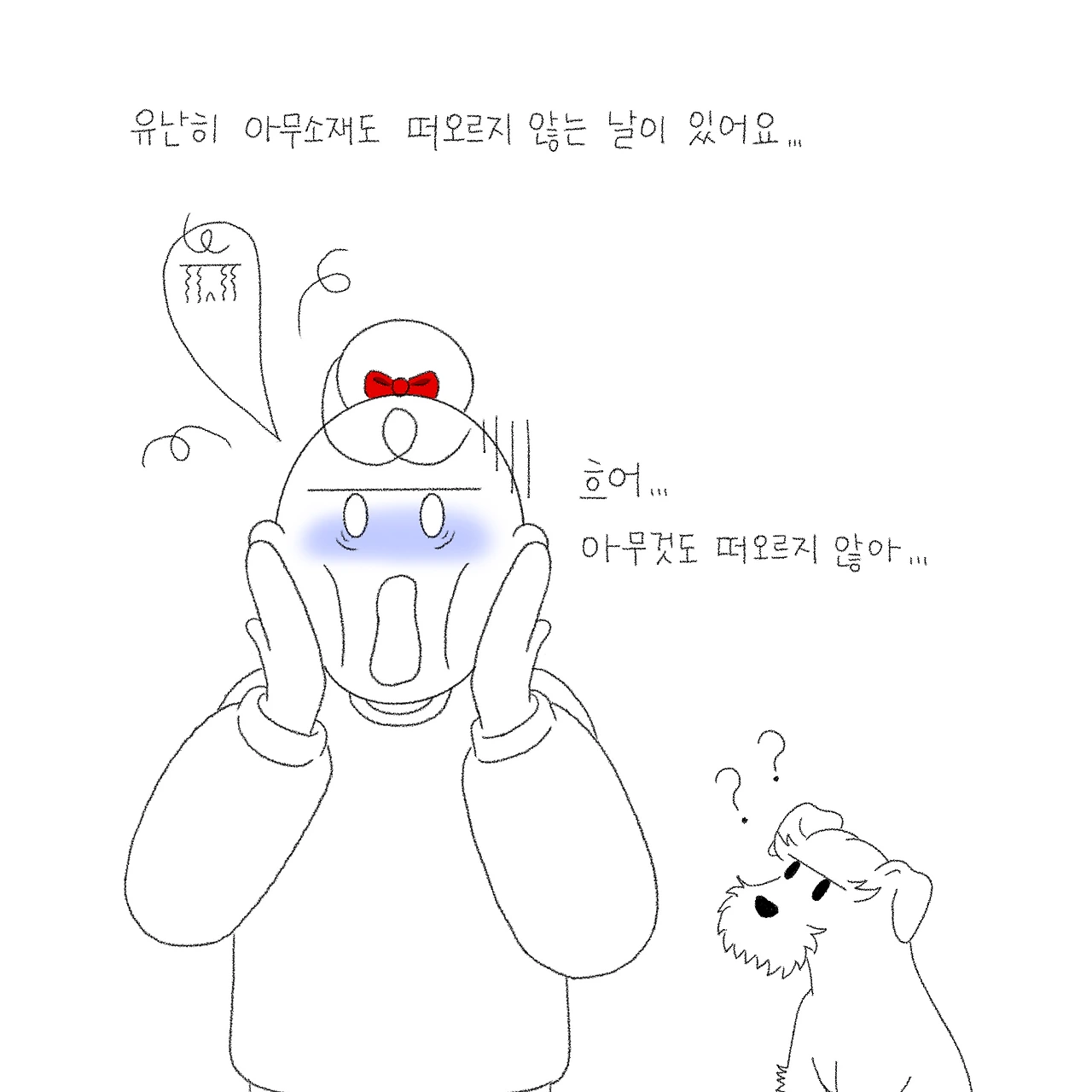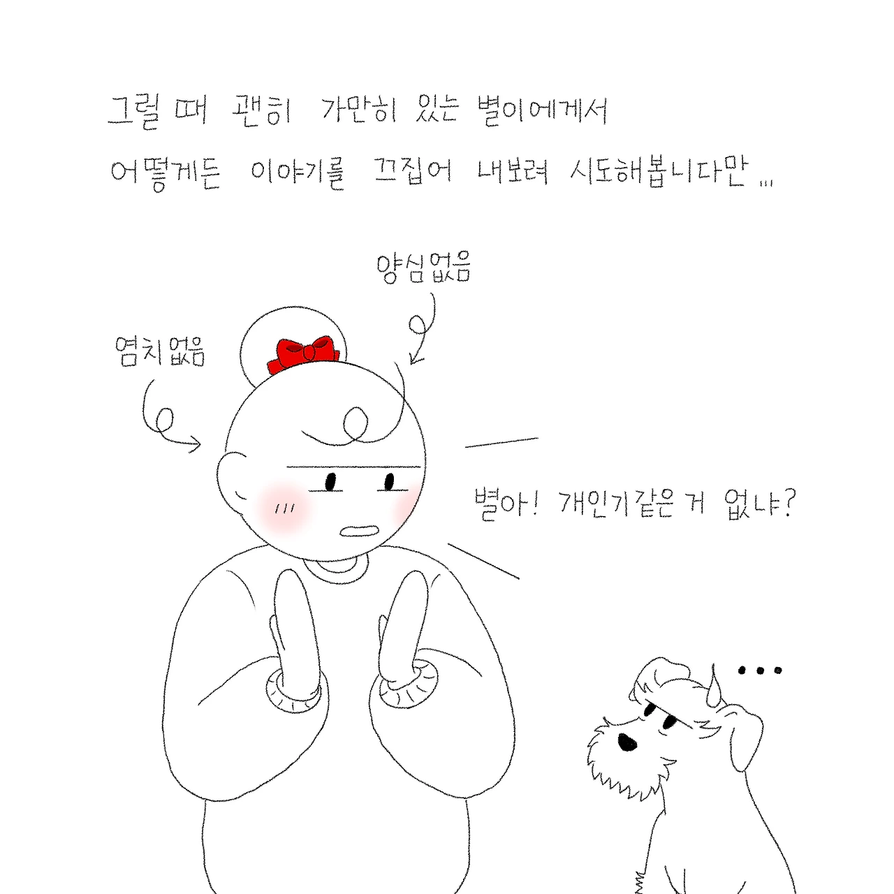 또 다른 이유를 떠올리자면 그냥 그런 날이 있는 것 같습니다. 지독하게도 아무 생각이 나지 않는 하루. 사진첩을 다시 뒤져보고 별이와의 추억을 다시 떠올려봐도 머리가 새하얗기만 한 날. 그럴 땐 괜히 가만히 있는 별이보고 '뭐 그릴까? 뭐라도 던져줘 봐~'하면서 애원 아닌 애원을 하기도 해요. 괜히 간식으로 장난을 쳐보기도 하고, '물어와!'를 시켜보기도 하고, TV에서 보았던 반려견들의 개인기를 시켜보기도 하지만 절대 꿈쩍할 별이가 아닙니다. 오히려 저 멀리 달아나 '히융' 하는 한숨 소리와 함께 등 돌리고 엎드려버리고 말아요. 가슴 아픈 외면의 순간입니다. 스멀스멀 다시 별이 주변에 다가가 뭐라고 해보자며 부탁을 해보지만 역시나 제 맘대로 될 리 만무하겠죠?