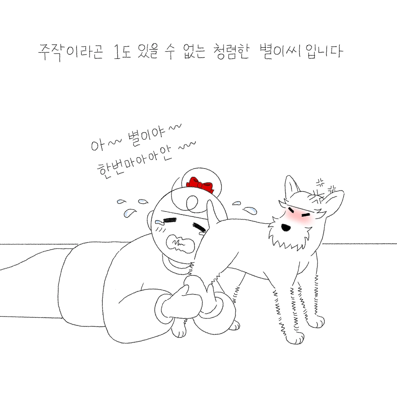이런 그림을 그릴 때면 창작자의 욕심일까요? 마음 깊숙한 곳에서는 주작이라도 해서 재미난 에피소드를 뽑아보고 싶지만 별이라는 특수성을 가진 제 이야기는 주작이 있을 수가 없습니다. 거짓말로 지어내기엔... 제 그림 상상력은 거짓말의 판타지에 따라가지 못하는 못하는 극 사실주의 그림이라... (본 그대로만 그릴 수 있는 그림실력도 한 몫합니다.) 소설이 아닌 별이와의 실제 스토리를 따뜻한 눈으로 담는 것이 제 이야기의 주된 목표이자 장점이기에 소재에 대한 갈망은 어쩌면 피할 수 없는 부분인 것 같습니다. 그저 별이의 모든 이야기를 담을 수 있게 그림에 정진하는 것이 지금 제가 해야 할 노력이겠죠?
