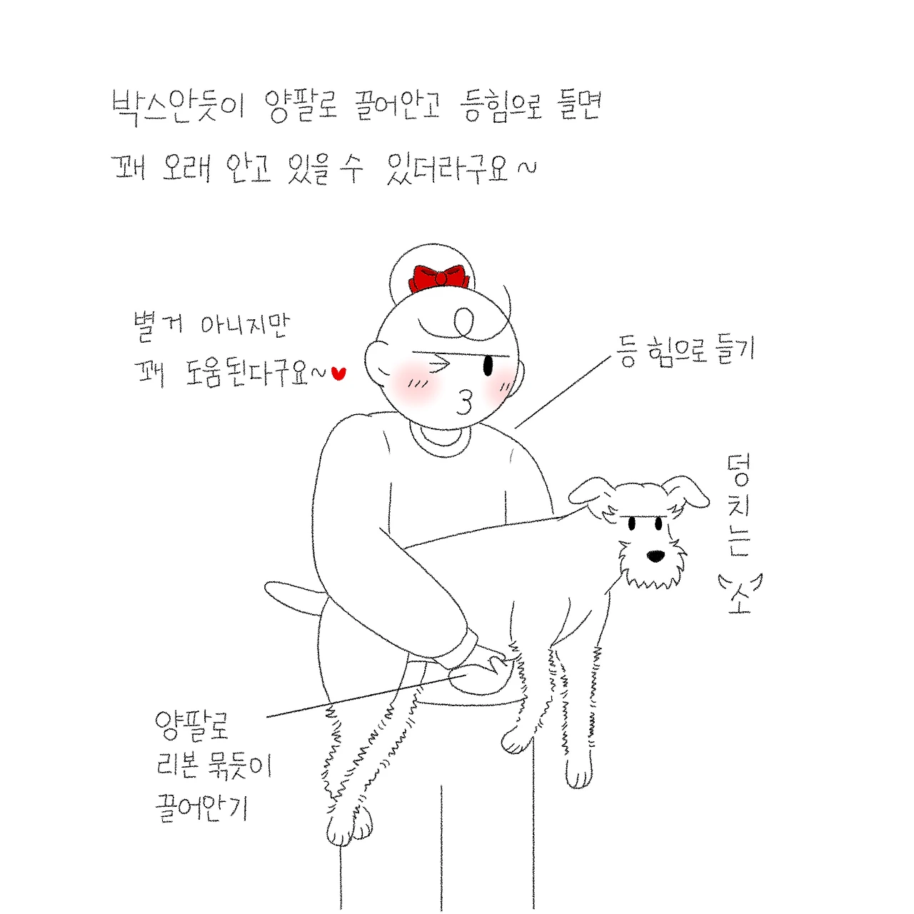 말기암이라 치료는 힘들고 더 심해지거나 아프지 않게 병원에서 처방한 많은 양의 약을 먹고 있습니다. 그중엔 스테로이드 성 약들이 있어 먹성이 심해지거나 살이 찌는 부작용을 겪고 있죠. 그렇다 보니 살이 2킬로 정도는 늘었습니다. 반려견에게 2킬로는 사람으로 치면 15~20킬로가 찐 거나 다름없다고 하니 굉장히 살이 찐 거라고 볼 수 있죠. 그런 별이를 안아 이동하다 보면 팔이 떨어져 나갈 것같이 아프고 다음날 근육통으로 팔에 힘이 들어가지 않기도 합니다. 그 예방차원에서 *개모차를 사긴 했지만 부피가 있다 보니 매번 가지고 나가기 불편하더라고요. 고민 고민하다가 안는 방법을 박스를 끌어안 듯 양손을 교차시켜 잡고 등힘으로 안는 듯한 모습으로 바꿨더니 이게 꽤나 버틸만하더라구요. 저 혼자 만족한 별 거 아닌 방법의 변화지만 1분 정도 안을 수 있었던 별이를 5분 정도는 거뜬하게 안고 이동할 수 있으니 꽤 큰 발전이라 생각합니다. 별이도 배 쪽을 안전하게 잡아주니 꽤 편하게 주변을 둘러보며 안겨서 오더라구요. 요즘은 이 방법으로 거뜬하게 안아 산책 중간중간 지친 별이를 쉬게 해주고 있습니다.