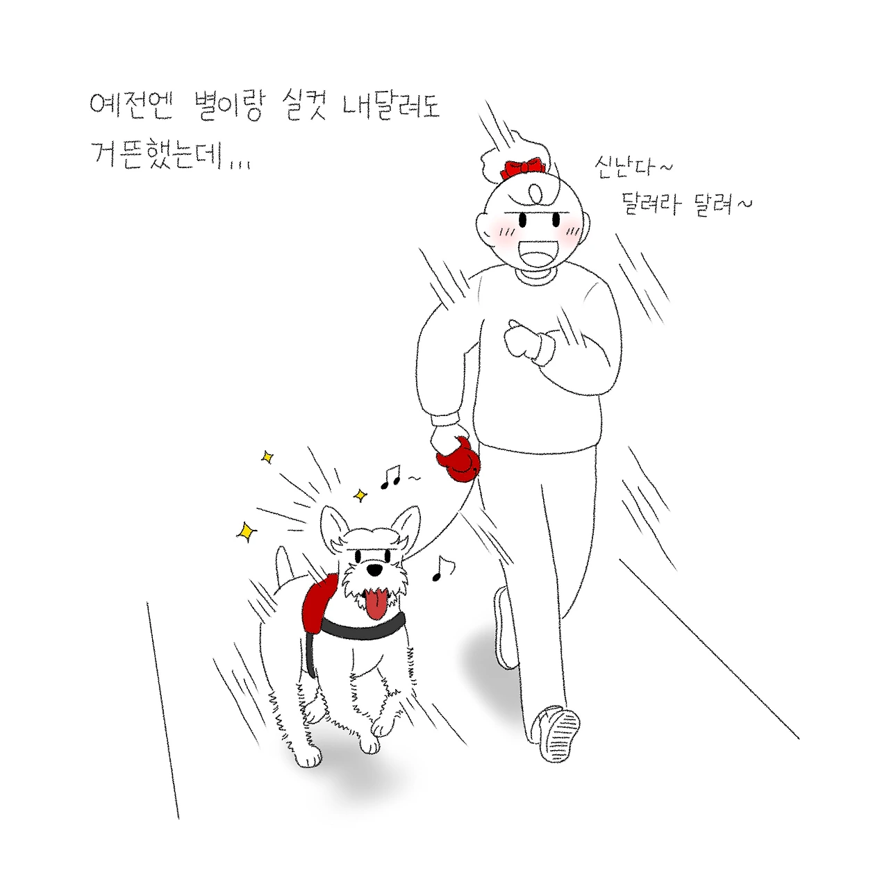 예전엔 매번 전력질주로 뛰면서 별이의 왕성한 힘을 발산시켜 기운을 빼는 게 산책의 목적이었습니다. 리드줄이 느슨해질 틈도 없이 팽팽한 산책을 하는 게 당연했고, 여기저기 사방팔방으로 다니며 동네를 누비며 '여기도 별이 왔다 갑니다' '저기도 별이 왔다 갑니다' 하고 흔적을 남기는 파워풀한 산책의 매일이었습니다. 그때 저도 별이 못지않게 같이 달리며 "저기까지 달리기 하자~ 별아 뛰어!!" 하며 전력질주도 하고 몇 시간씩 별이를 맞추며 동네를 누볐는데... 이제는 별이도 저도 체력이 예전 같지 않아 금방 지쳐버리곤 합니다. 그땐 어떻게 그렇게 열정적인 산책을 했나 싶습니다. 돌이켜 생각해보니 별이 어렸을 땐... 저도 어렸더라구요. 하하하.