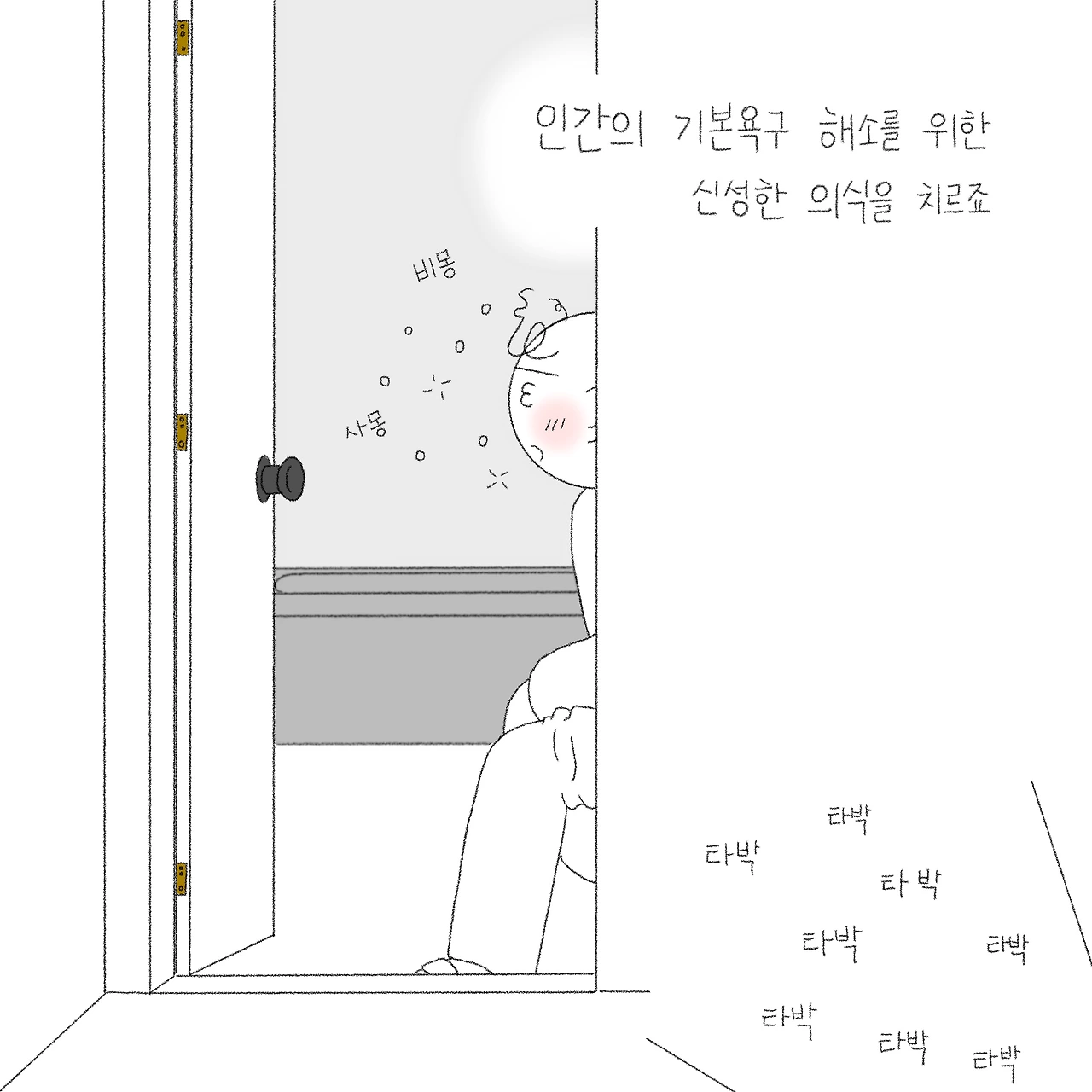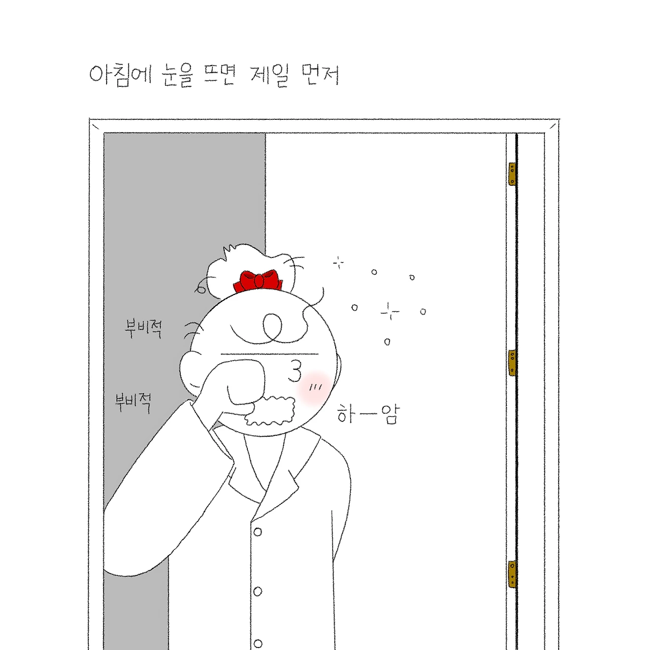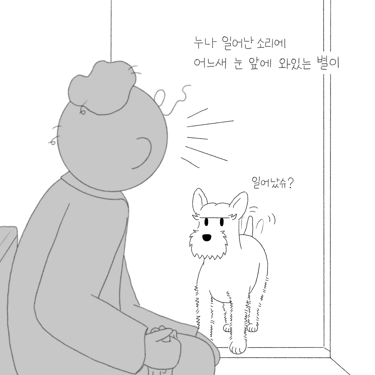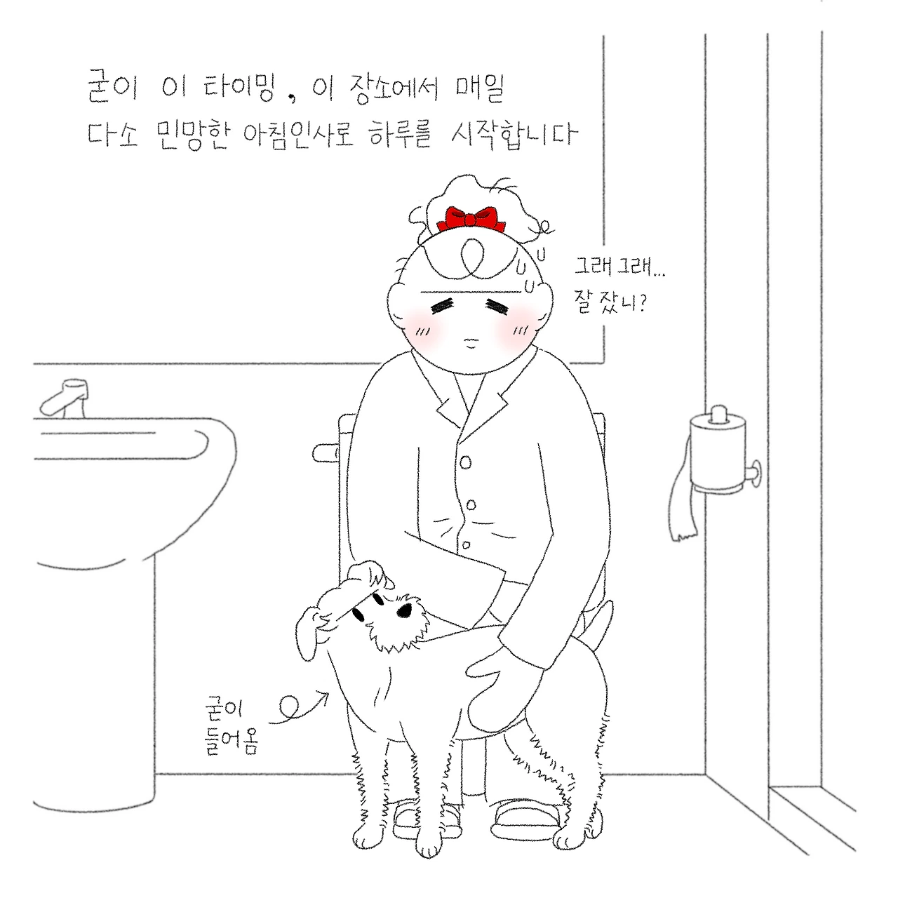 겨우 뜬 눈을 부비적 거리며 방 밖으로 나서 화장실에 들어가면 멀리서 타박타박 걸어오는 발소리. 눈도 채 뜨지 못했지만 알고 있다. 별이가 옆에 와있다는 것을. 당연한 듯 자연스럽게 손을 내밀면 별이가 스윽 얼굴과 등을 내밀며 만져달라 들어온다. 이것이 별이식 인사. 밤새 잘 잤냐며, 그 밤동안 보고 싶었다며 매일 반가운 몸짓으로 인사를 건넨다. 다소 민망한 장소와 이상한 타이밍이지만 매일 이렇게 별이와 아침인사를 나눈다. 나가서 더 제대로 인사해도 되는데 말이지...
