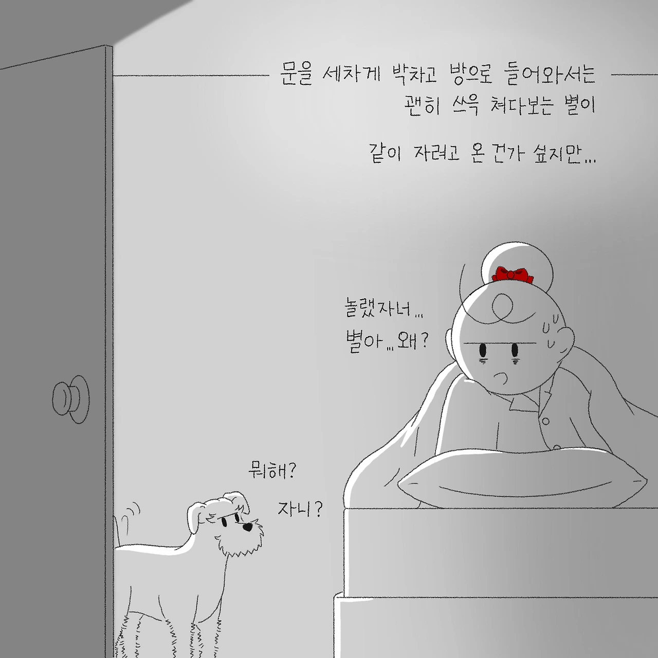 별이는 엄마 바라기인지라 엄마랑 잠을 잔다. 섭섭하지만 방에 들어가 홀로 잠을 청하는 외로운 나. 방문을 닫으면 긁으면서 더 집착하는 별이라 방문을 조금은 열어놓고 잠을 자는데 종종 별이가 세차게 박차고 들어와 나를 한번 쓱 쳐다보고는 그냥 '획' 돌아 그냥 가버리곤 한다. 같이 자려고 온건가 싶어 물어봐도 그냥 돌아서 나가버리니 묘한 마음의 상처가 이만저만이 아니다. 그렇지만 그것은 같이 자주지 않은 것에 대한 서운한 마음이 든 내 속 좁은 생각일 뿐.