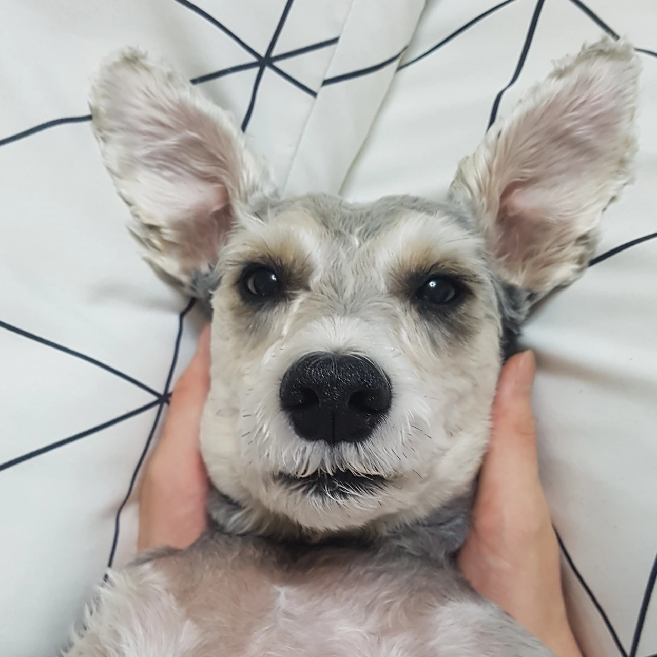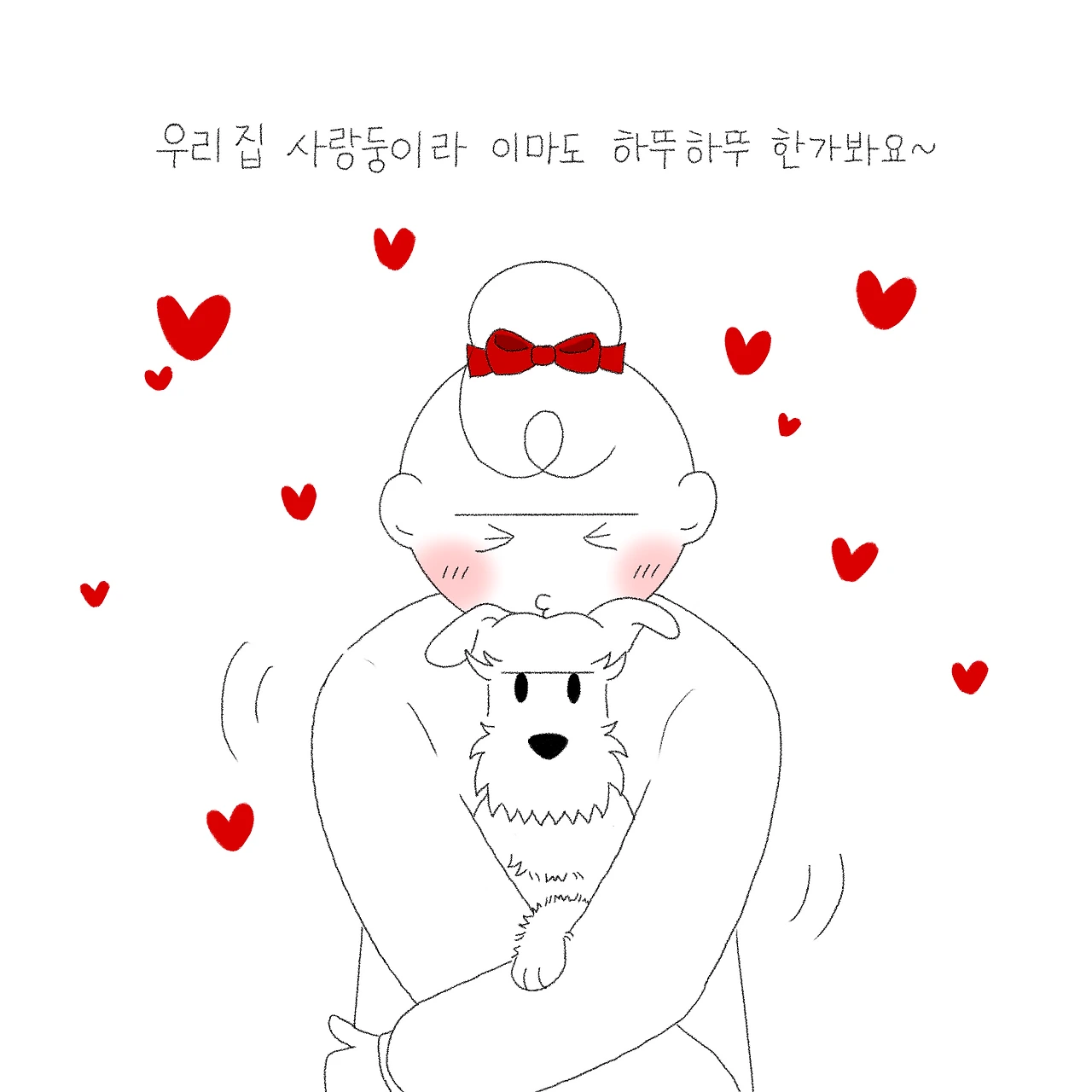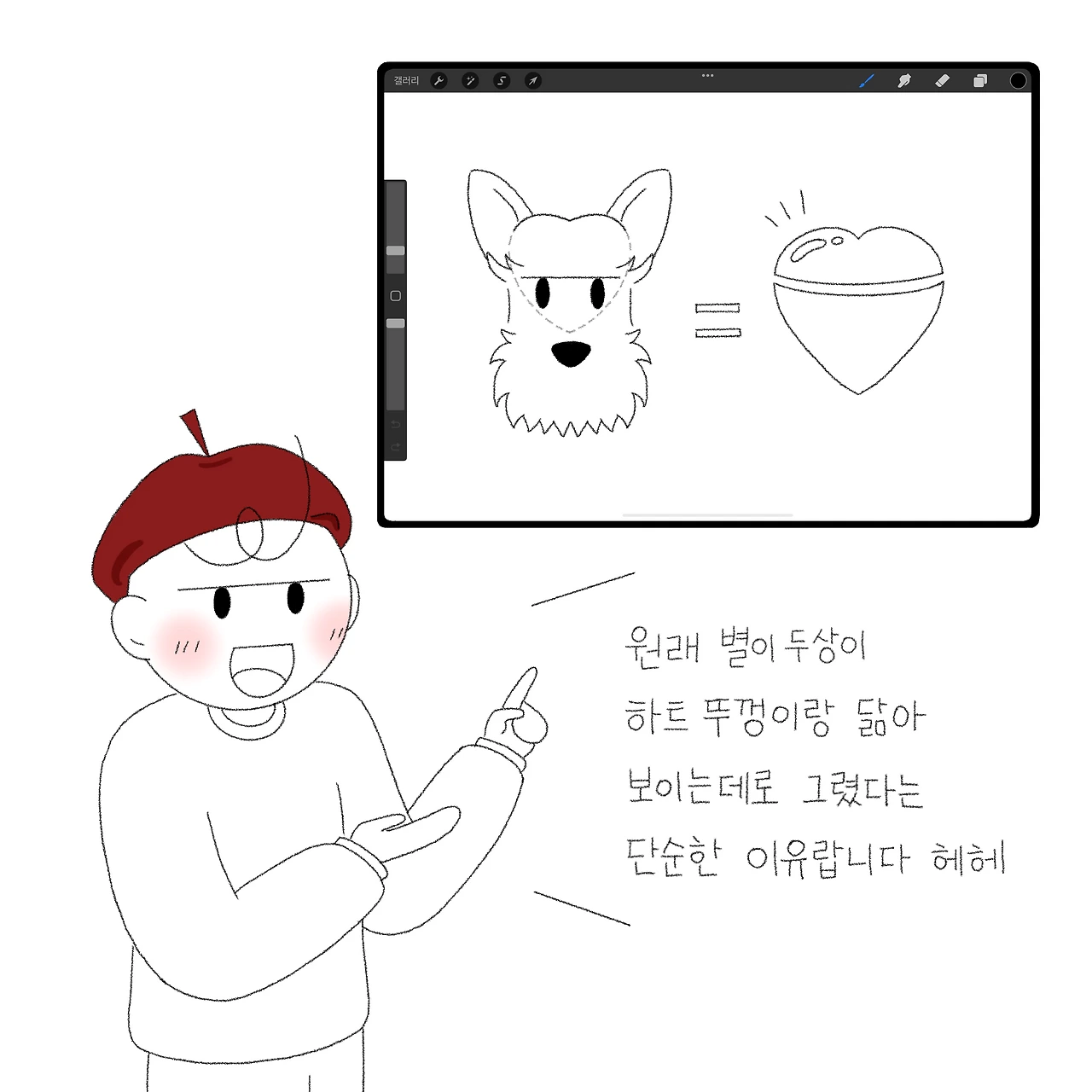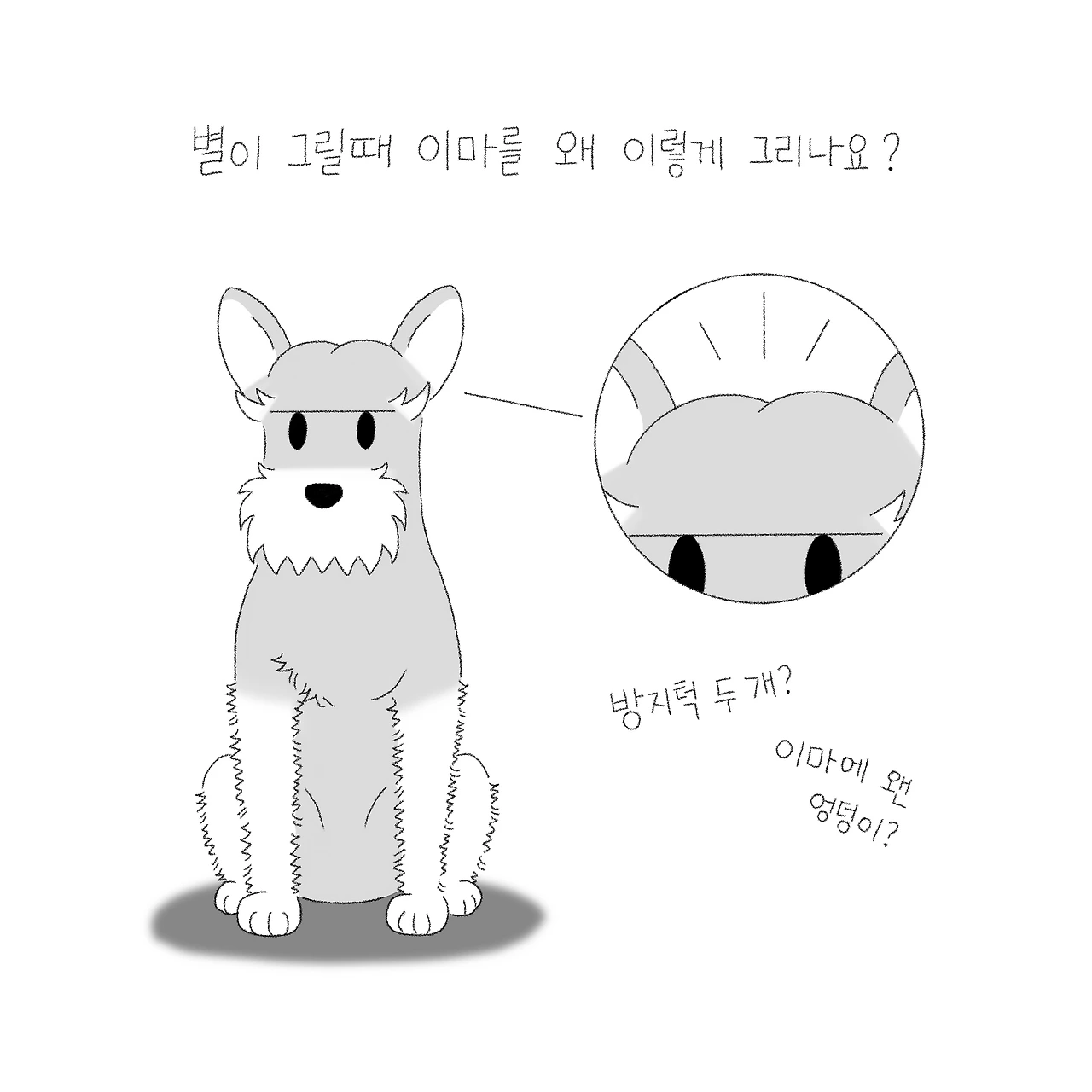 별이를 그릴 때 고민이 많았어요. 어떻게 그리면 별이라는 개성을 드러낼 수 있을까? 슈나우저라는 종의 특성상 눈썹과 수염이라는 큰 특징이 있지만 그래도 모든 슈나우저 중에 구분이 되는 한 포인트가 필요했죠. 별이를 관찰해보니 별이는 피부 때문에 바짝 깎여있는 시간이 많은데 두상이 유난히 이쁘더라고요. 봉긋 매끈한 언덕이 두 개가 있는 듯한 모습이 마치 하트 모양의 윗부분 같아 보여서 제가 '하트 두상'이라 불렀어요. 그게 포인트가 될 것 같더라고요. 그래서 처음 별이를 그리기 시작했을 때 이마는 하트처럼 그리기 시작했더니 그게 자리 잡아 별이의 그림체가 되었어요. 너무 귀여운 하트 이마에 입과 코를 콕 박으면 묘하게 싹 감싸지는 듯 쏙 들어간 이마 부분과 찰떡으로 맞아떨어진답니다. 얼마나 기분이 좋은지 몰라요.