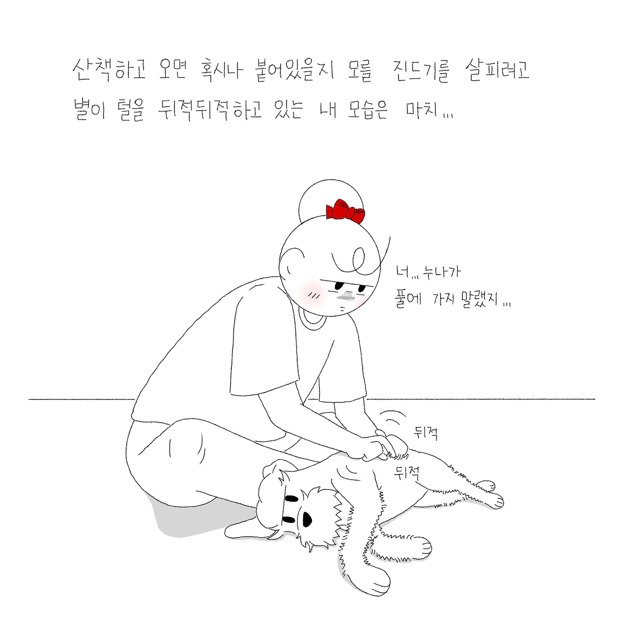 풀에 코를 박고 냄새 맡는 것을 좋아하는 별이기에 산책할 때 무성한 수풀에 가면 겁부터 난다. 방심한 찰나에 그 수풀에 몸을 스치고 오면 혹시나 진드기를 붙여오진 않았을까 별이 털을 이리저리 뒤적여 진드기를 찾아본다. 정말 점보다도 작은 크기의 진드기도 있기에 방심할 수 없다. 차마 못 보고 돌아온 집 카펫에 먼지가 움직이길래 놀래서 봤더니 진드기였을 때의 경악스러움이란... 그렇기에 초장에 잡아 털어내는 게 가장 좋다.