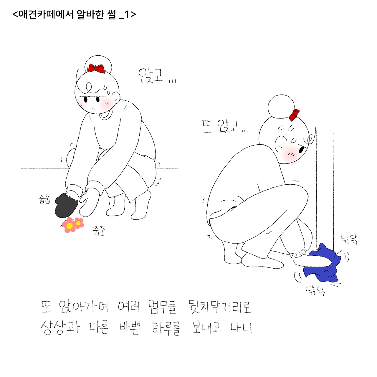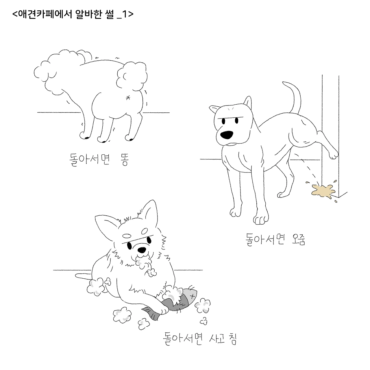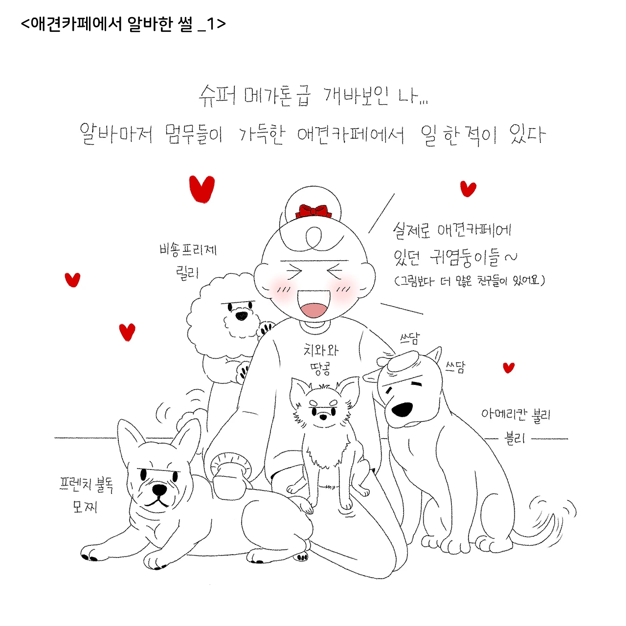 지금의 직업을 갖기 전까지 나는 프리랜서였다. 작은 공연이나 디자인을 하며 간간히 먹고살고 있었는지라 일이 없을 때의 가난한 내 통장을 대비하기 위해서라도 파트타임 아르바이트는 필수불가결이었다. 다양한 아르바이트를 했지만 슈퍼 파워 메가톤 급 개바보인 나에게 가장 인상이 깊은 아르바이트는 애견카페였다.
