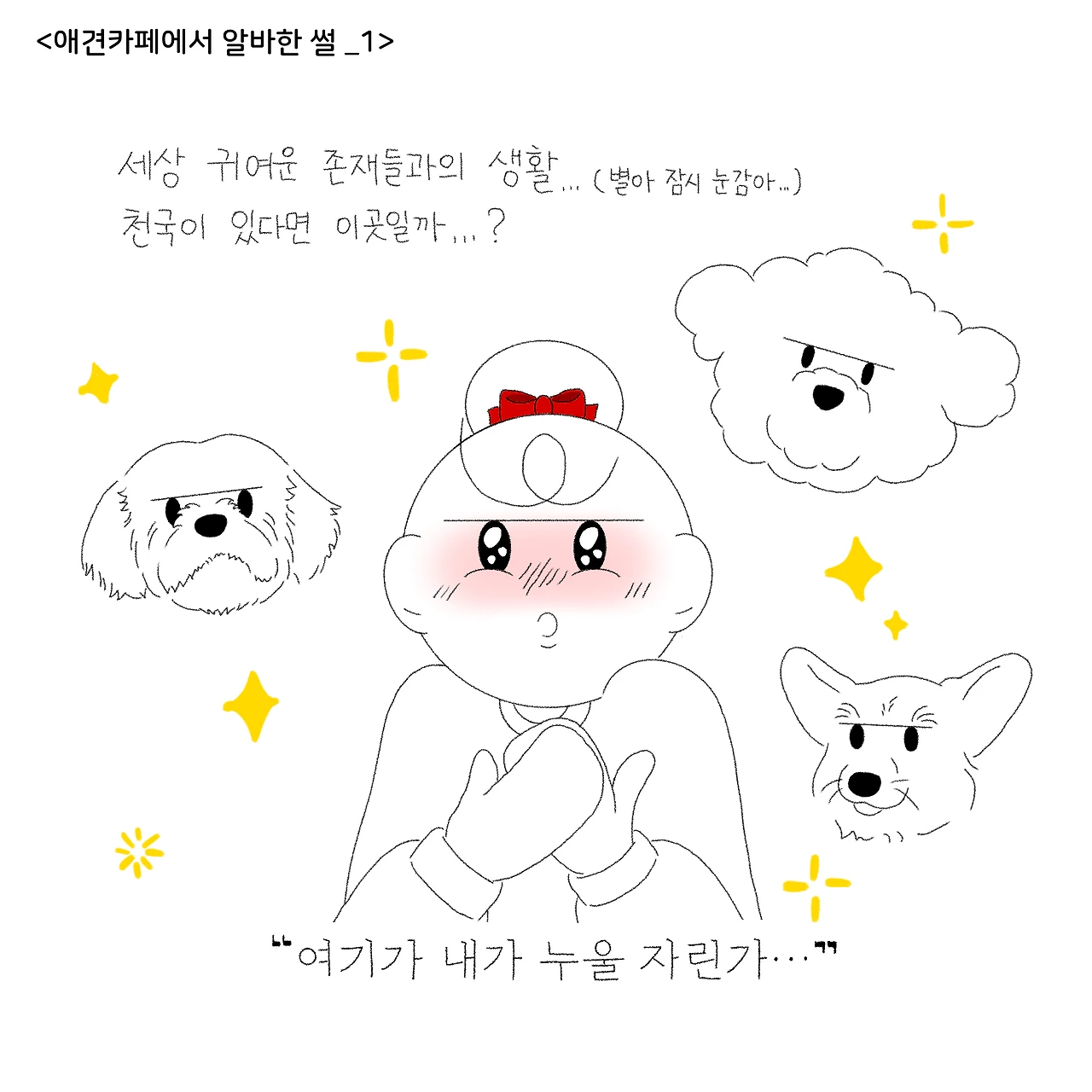 내가 일한 애견카페는 반려견 7마리에 고양이 1마리가 사장 부부와 함께 살고 있는 동네 애견카페로 동네 반려인과 반려견들이 와서 같이 어울려 놀면서 커피 한 잔 하고 갈 수 있는 공간이었다. 다양한 아르바이트 경험으로 웬만한 일들을 다 할 수 있었던 터라 알바생은 나 하나뿐이었지만 크게 어렵지는 않았다. 특히 만족할 수밖에 없는 근무환경. 매일 귀여운 생명체들이 이리 뛰고, 저리 뛰고, 놀아달라 만져달라 쫄쫄 따라오는 행복. 별이한테서만 느꼈던 행복을 여기 오면 몇 배가 되니 매일 출근하는 게 즐거울 수밖에...