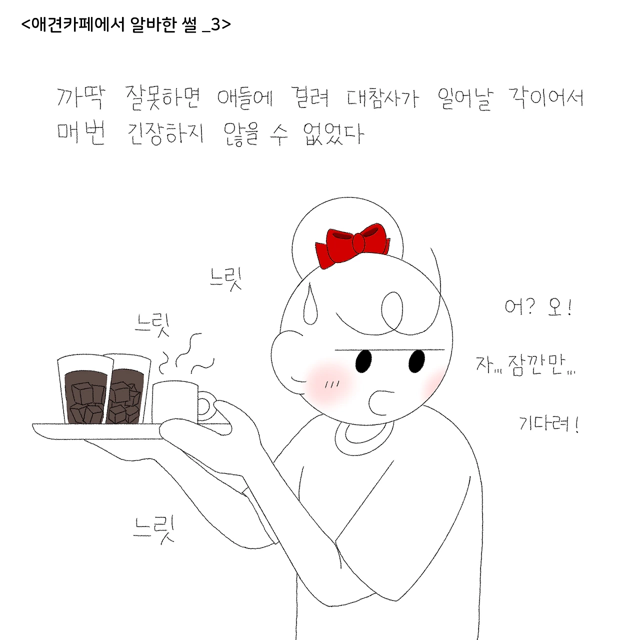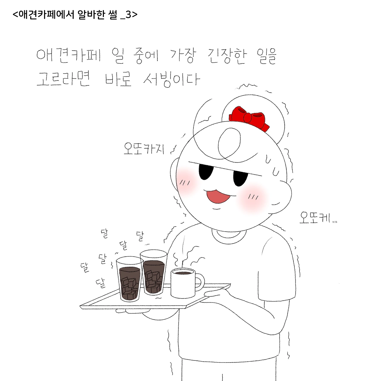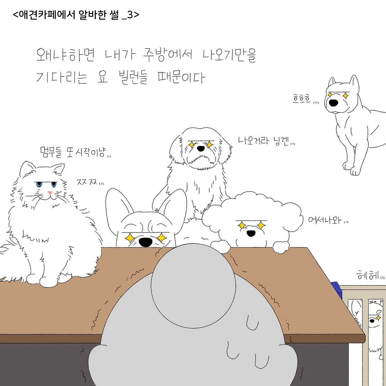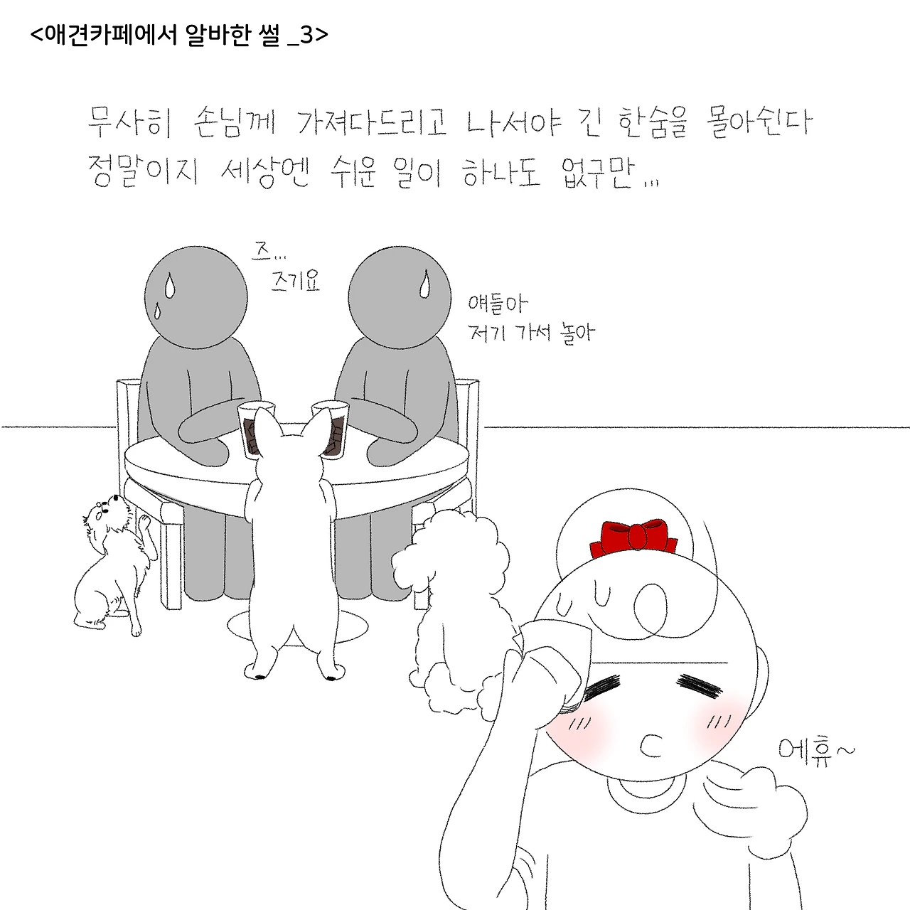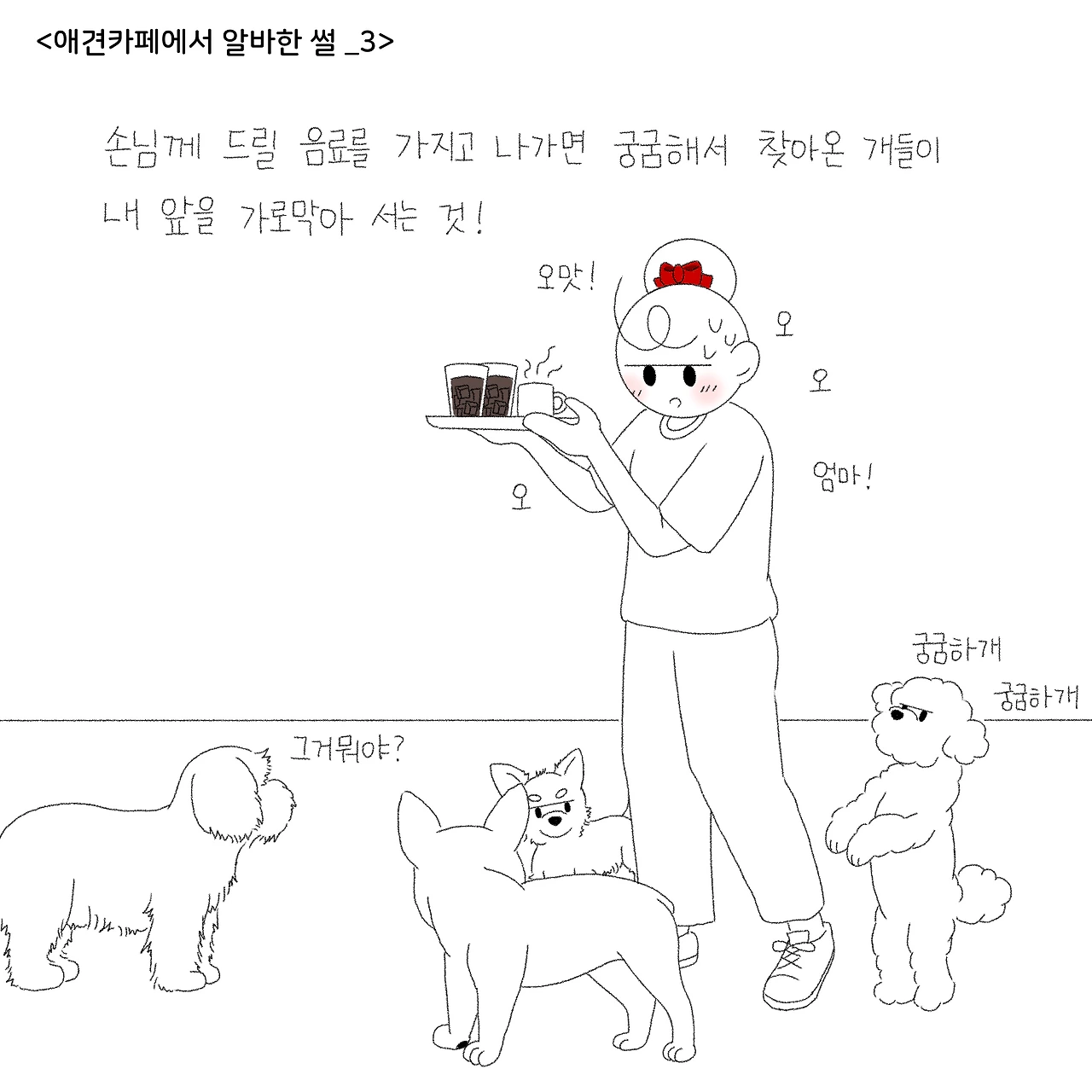 거의 굳은 목석처럼 느릿느릿 손님께 가져다 드리면 웃으면서 손님들이 와서 받아주시기도 하고 고생한다며 한 마디씩 건네주기도 한다. 개를 키우는 분들이니 웬만하면 이 입장을 다 이해해주셨다. 감사할 틈도 없이 그 손님 곁에 우르르 몰리는 궁금증 가득한 장난꾸러기들 때문에 멋쩍은 웃음과 안도의 한숨을 내쉬며 내 자리로 돌아와 잠시 긴장을 내려놓는다. 어느새 내 주변엔 아무도 없고 손님 주변에 우글우글 몰려있는 녀석들을 보면 실소가 절로 나온다. 하하. 어쩜 저렇게 천연덕스러울까? 내 긴장을 저 녀석들은 알고는 있나? 뭘 바라...