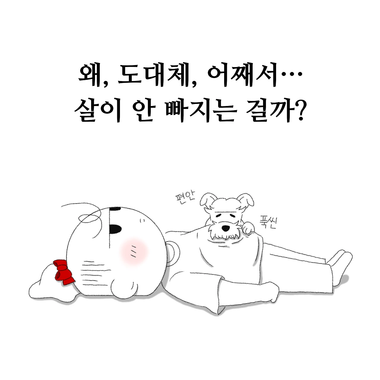 개를 키우면 활동량이 많아진다. 별이를 처음 데려 왔을 때부터 지금까지 하루도 쉬지 않고 산책을 나가야 했고, 별이가 뛰는 만큼 뛰어야 했고, 별이가 노는 만큼 놀아야 했다. 그나마 나이가 들어 활동량이 많이 줄어들었지만 그래도 여전히 매일 1시간 이상 산책을 나가고 있다. 이런 생활을 11년째 이어나가고 있지만 한 가지 풀리지 않는 의문... 왜, 도대체, 어째서 내 살은 빠지지 않는 걸까?