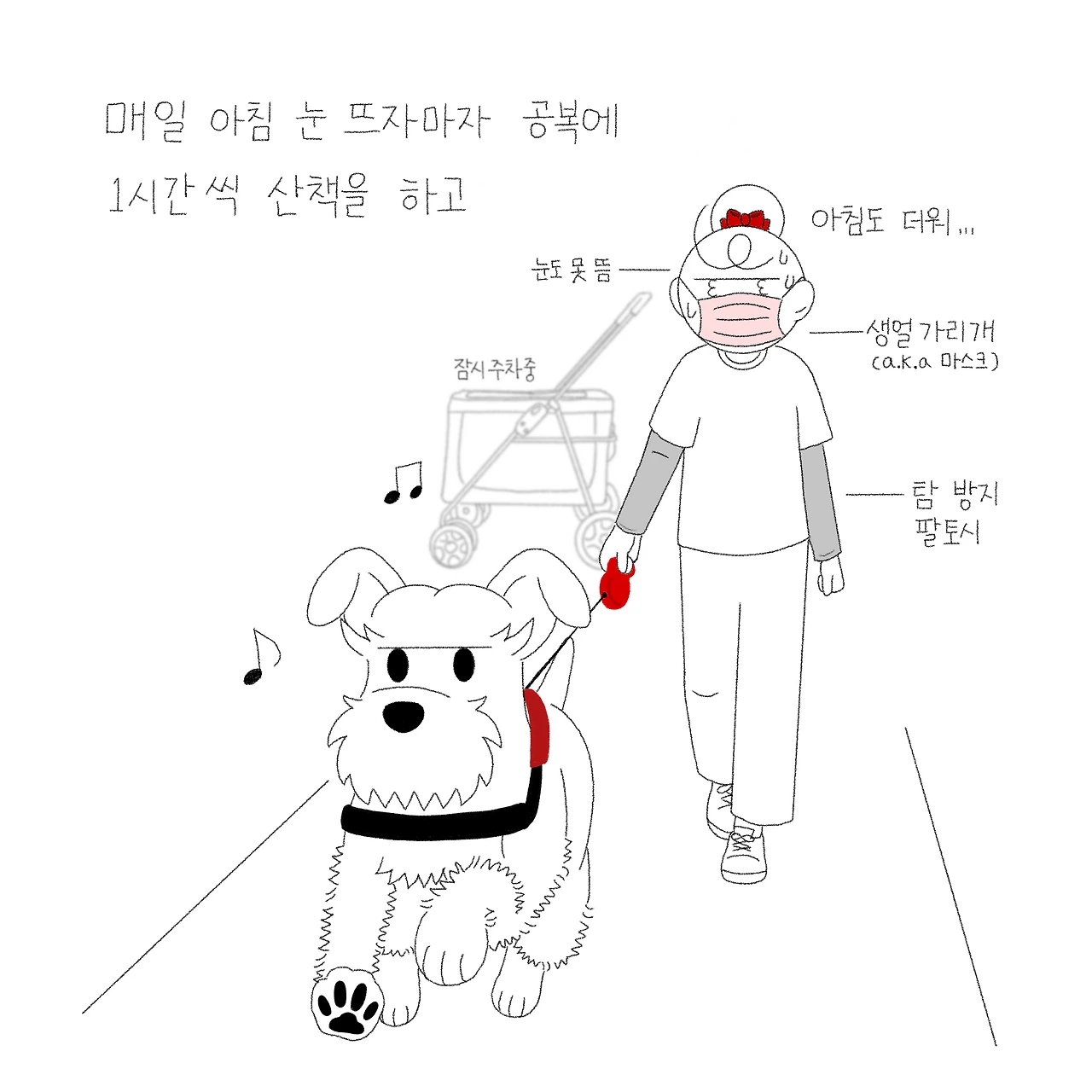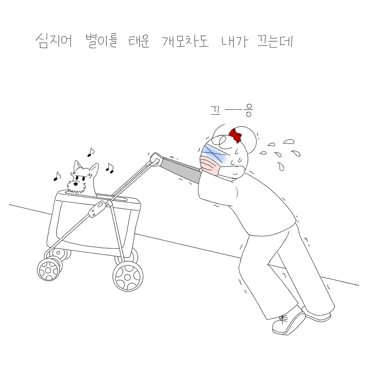 아침 7시. 눈을 뜨자마자 산책을 나선다. 1시간 가까이 걸리는 별이만의 산책 코스를 다녀오면 요즘 같은 계절에 땀이 비 오듯 흐른다. 심지어 요즘은 개모차도 끌고 나가서 한 손엔 별이 리드줄을, 한 손엔 개모차를 컨트롤해가며 산책하다 별이가 지치면 태워서 한껏 무거워진 개모차를 끌고 집에 돌아오는 것이 일상이다. 집에 오면 그 무거운 별이를 안고 화장실로 데리고 가 씻긴 다음, 이리저리 소독 용품을 챙겨 별이 다리에 있는 상처를 드레싱한 후, 냉찜질까지... 아침 공복에 이런 노동이 따로 없다. 이런 매일의 연속인데... 정말 단 하루도 쉬지 않는데 왜 살은 빠지지 않는지... 심지어 별이가 어릴 땐 같이 달리기도 하고 매일이 체육대회 같은 나날이었는데도 말이다.