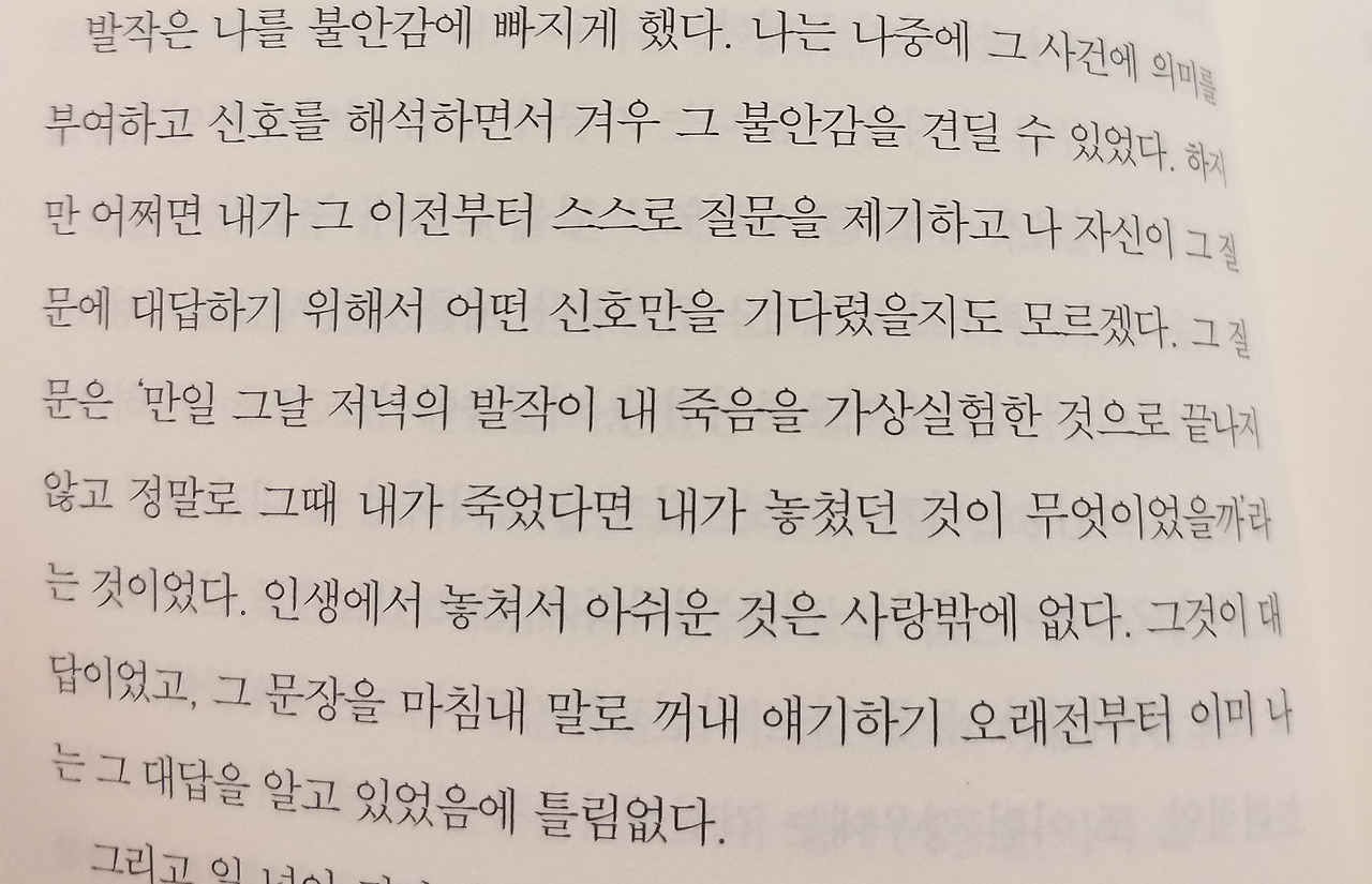 인생에서 놓쳐서 아쉬운 것은 사랑밖에 없다. 그것이 대답이었고, 그 문장을 마침내 말로 꺼내 얘기하기 오래 전부터 이미 나는 그 대답을 알고 있었음에 틀림없다.