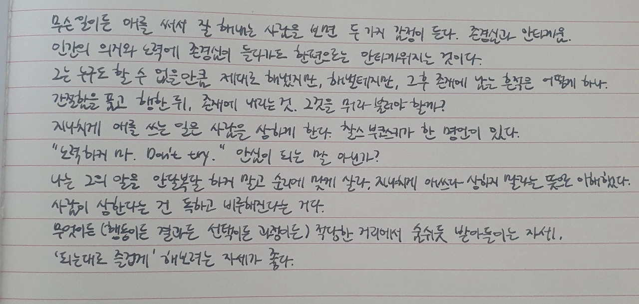 "노력하지 마. Don't try." 안심이 되는 말 아닌가? 나는 그의 말을 안달복달하지 말고 순리에 맞게 살라, 지나치게 애쓰다 상하지 말라는 뜻으로 이해했다. 사람이 상한다는 건 독하고 비루해진다는 거다. 무엇이든 (행동이든 결과든 선택이든 과정이든) 적당한 거리에서 숨 쉬듯 받아들이는 자세. '되는 대로 즐겁게' 해보려는 자세가 좋다.