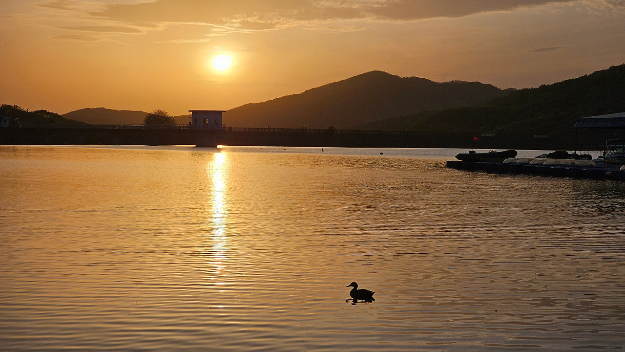 조금 걷다 보니 해가 산 저편으로 넘어가고 있었다. 아직 봄이라 낮이 길지 않았다. 그런데 해가 지기 시작하니 풍경이 순식간에 달라졌다. 사방이 붉은 금빛으로 물들었다. 동시에 호수는 점점 고요해졌다. 저쪽으로 가면 더 아름다운 풍경이 보일 것 같아 바쁘게 걸었다. 그러고는 드디어 결정적 장면을 마주하게 됐다.