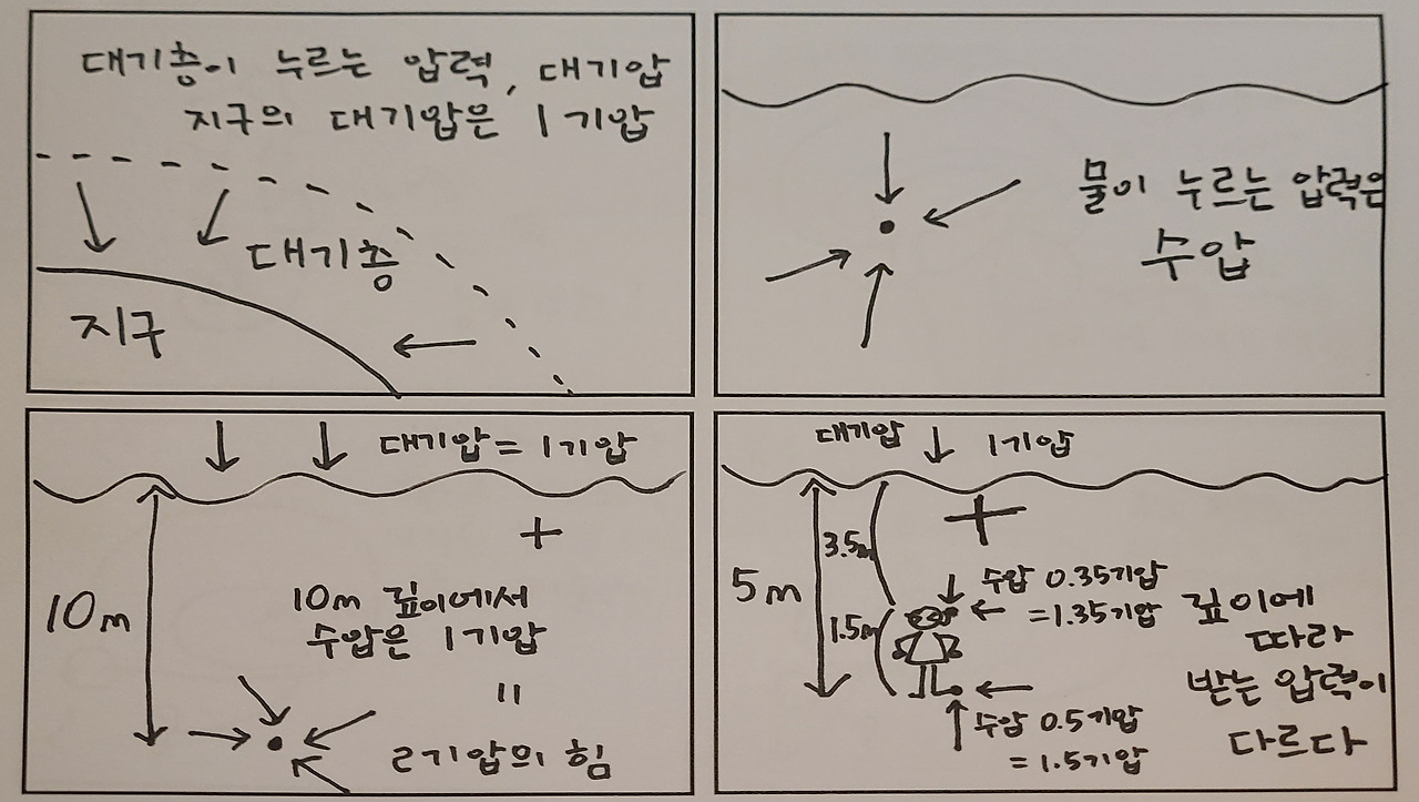수압은 물의 무게에 의해 발생하는 압력이다. 아쿠아리움에 들어간 나를 둘러싼 물이 사방에서 누르는 힘을 느끼는 것이다. 사실 물 밖에서도 우리는 지구를 둘러싼 공기층에 의해 눌려 있는데 공기의 무게에는 이미 익숙해져 있기에 대기의 압력을 실감하지 못한다. 지구의 해수면 근처에서 측정한 대기층의 압력을 1기압이라 하는데, 물 속으로 들어가면 대기층이 누르는 1기압의 힘에 물이 누르는 힘까지 더해져 그 압력을 체감하게 된다. 깊이 들어갈수록 우리를 누르는 물의 양이 많아지기 때문에 물의 깊이에 비례하여 수압이 커진다.